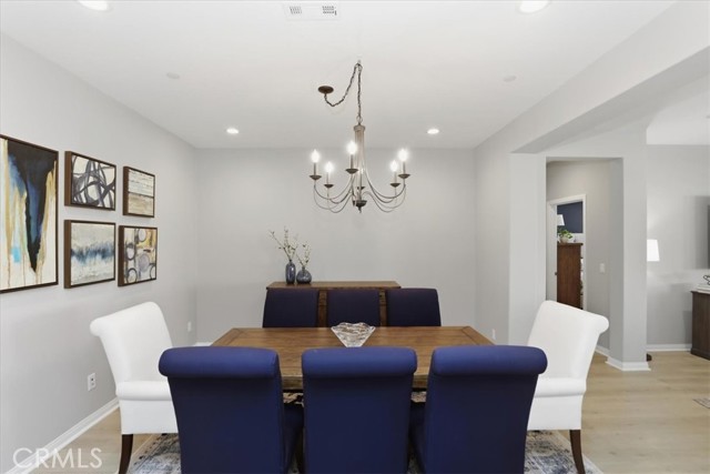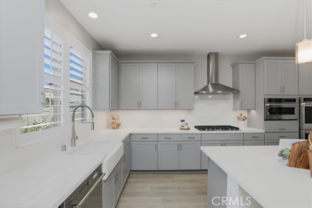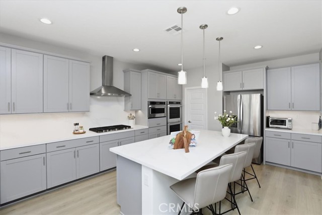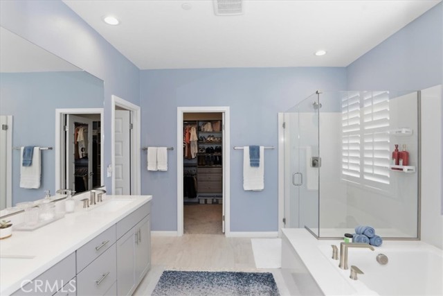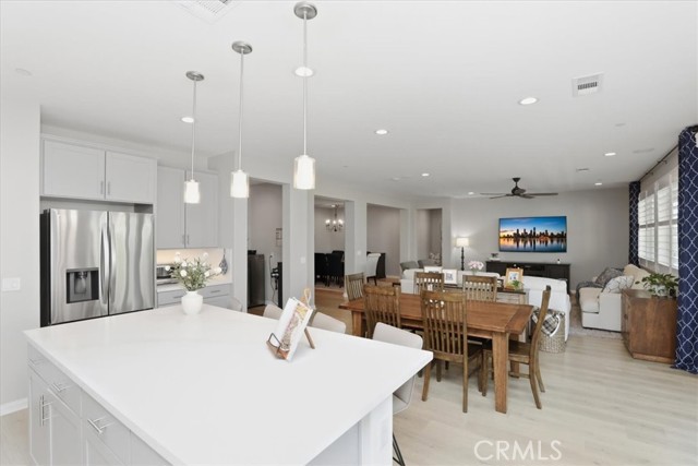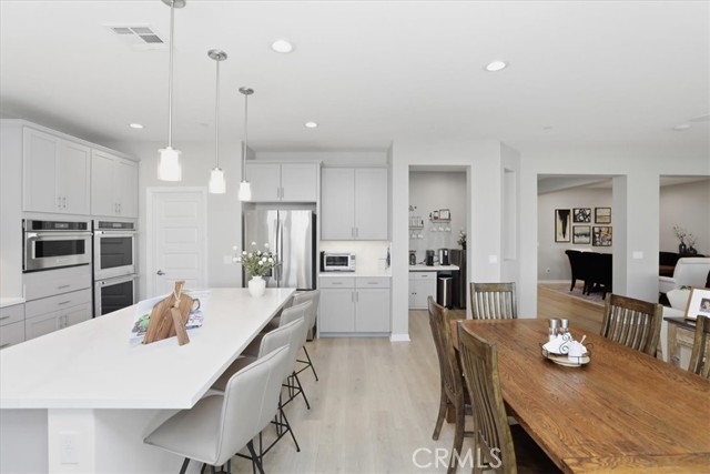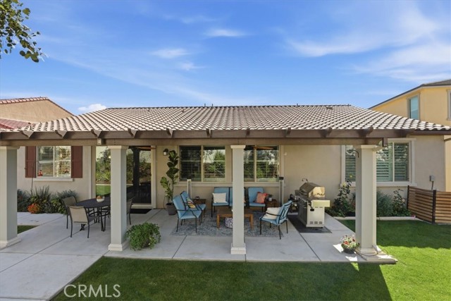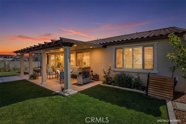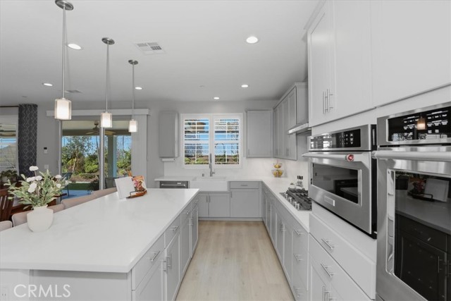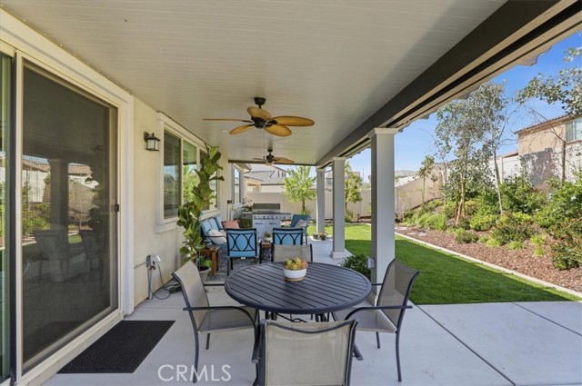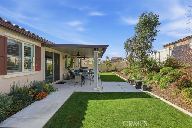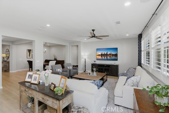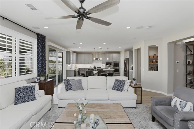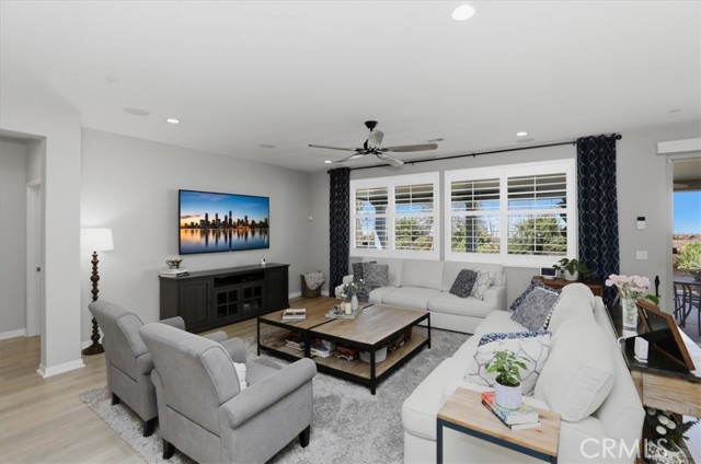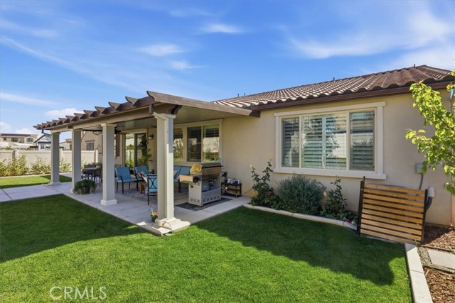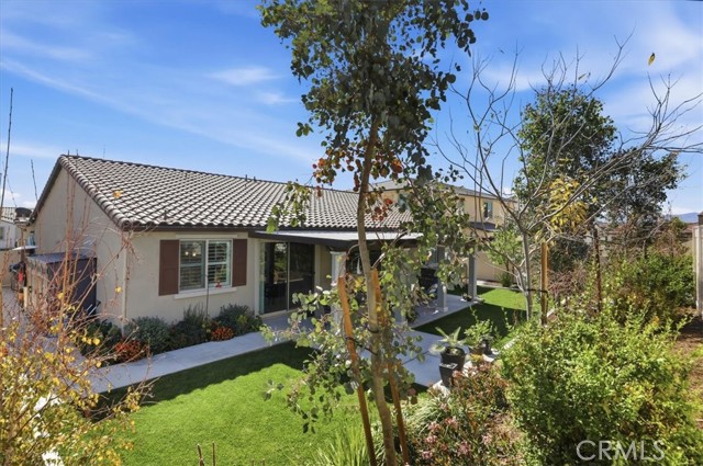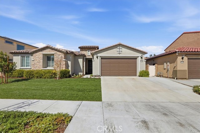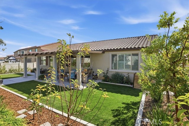 The open and inviting fWelcome to this beautifully upgraded single-story home located in a sought-after newer gated community of Highland Grove. Less than 3 years old, Offering 2,550 square feet of thoughtfully designed living space, this spacious residence features four bedrooms and three full bathrooms, perfectly blending comfort and functionality. The open and inviting floor plan includes a formal living room and a formal dining room, ideal for entertaining guests or hosting special gatherings. At the heart of the home is a stunning upgraded kitchen showcasing elegant quartz countertops and backsplash, premium stainless steel KitchenAid appliances, and abundant cabinetry, pendant lighting, porcelain farm sink, under cabinet accent lights and pantry—designed to impress even the most discerning chef. The family room is perfect place to unwind, very spacious and equipped with 5.1 speaker system. The private primary suite is a true retreat, featuring a spa-like bathroom with luxurious finishes, dual vanities, frameless shower, soaking tub and a spacious walk-in closet complete with custom built-ins for optimal organization. Additional highlights include a three-car tandem garage offering ample parking and storage space, along with modern upgrades throughout the home that enhance both style and convenience. Other amenities include ceiling fans, walk-in closets in secondary bedrooms, tech center currently used as a coffee bar, plantation shutters, drapes, 9 ft ceilings, integrated smart home technology and energy efficient designs to include a solar system with a battery, tankless water heater, three-car tandem garage offering ample parking and storage space, alluma=wood patio cover, professional lush landscaping, along with modern upgrades throughout the home that enhance both style and convenience Residents of this gated association enjoy resort-style amenities including a sparkling community swimming pool, spa, fire pit, cabana and a playground for children, creating the perfect balance of relaxation and recreation. This exceptional single-story home combines upscale living with the benefits of a vibrant, amenity-rich community—an opportunity you won’t want to miss!