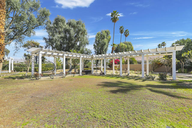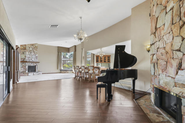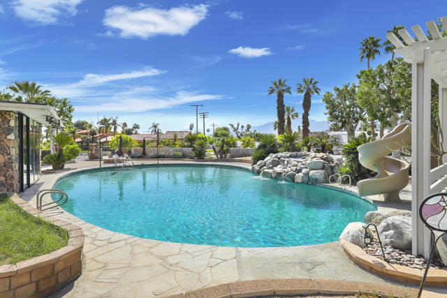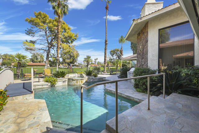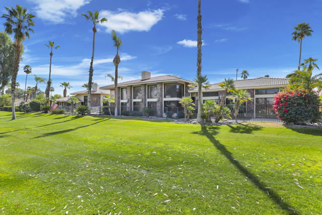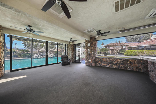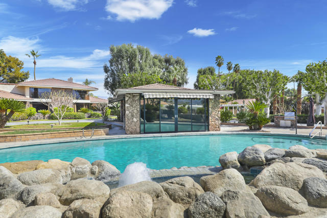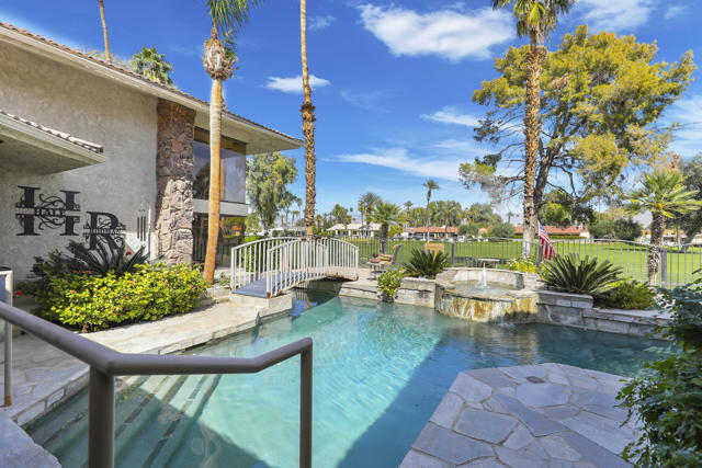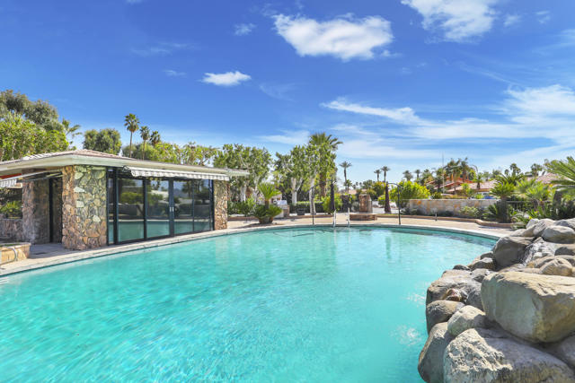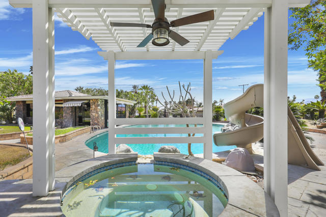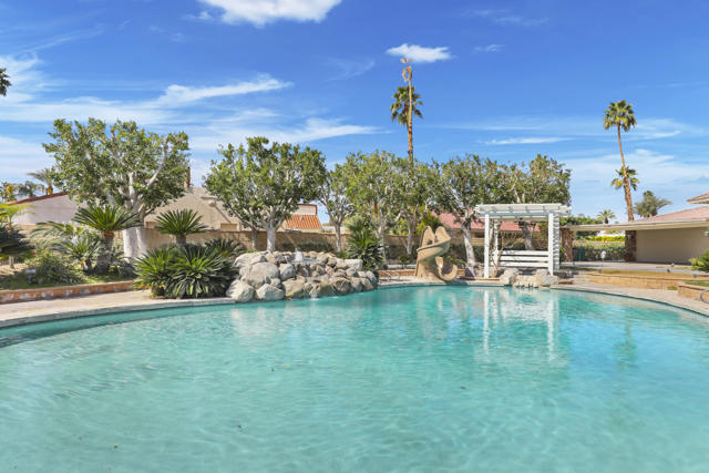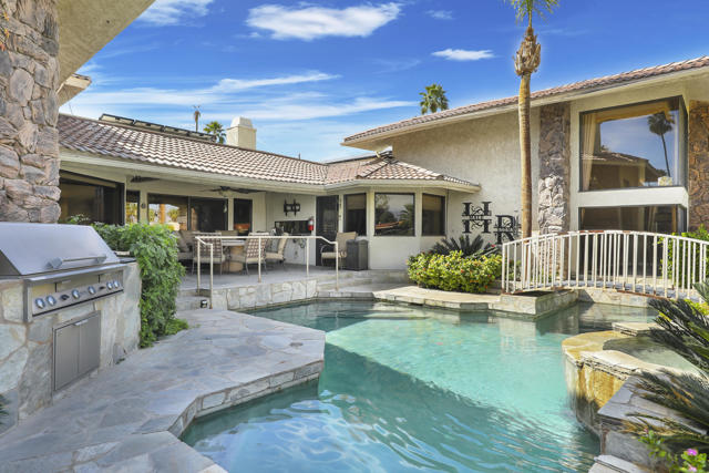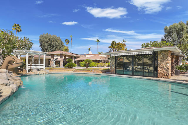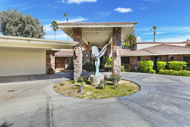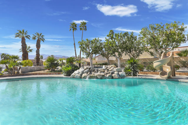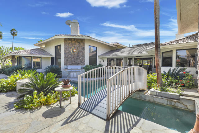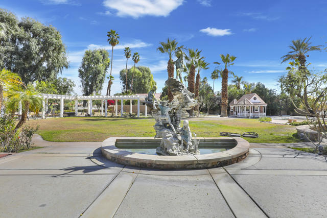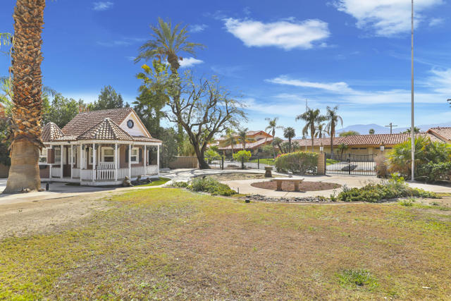 Wonderful opportunity to own a 5,857 sq.ft., 5 bedroom 6 bathroom custom built home on over an acre lot. There are two parcels included with this purchase: APN 609-152-008 and 609-290-001. The grand foyer leads to the formal living and dining rooms which feature large windows with views of the golf course and a see-thru fireplace. The spacious family room has two fireplaces and a wet bar. Gourmet kitchen with breakfast nook overlooks the rear patio and boasts granite counters and stainless steel appliances. The home includes a private guest quarter with a full kitchen, living room, bedroom and bath. The primary suite with soaring ceilings, walls of glass and a stunning bathroom with separate shower and spa tub, with an adjacent Texas-sized walk in closet and another laundry room with 1/2 bath. Concrete/stone hard scape with unique landscape details which include: Block walls/iron gates, covered porch/patios, pergolas, art sculptures, TWO separate swimming pools with waterfall/fountain features, and a 460 sq.ft. pool house. One of the pools is adjacent to the golf course and has a convenient built-in BBQ. The other hotel-sized lagoon pool with spa even has a slide for the kiddos!! One of the parcels has its own well and includes beautiful sculptures, as well as a Victorian playhouse. The attached 1241 sq.ft. garage with a second laundry facility has plenty of room for your cars and toys!! There is too much to mention here - call for a showing. HOA of only $214 a month includes cable TV with two boxes and internet with Spectrum, as well as 24-hour security.