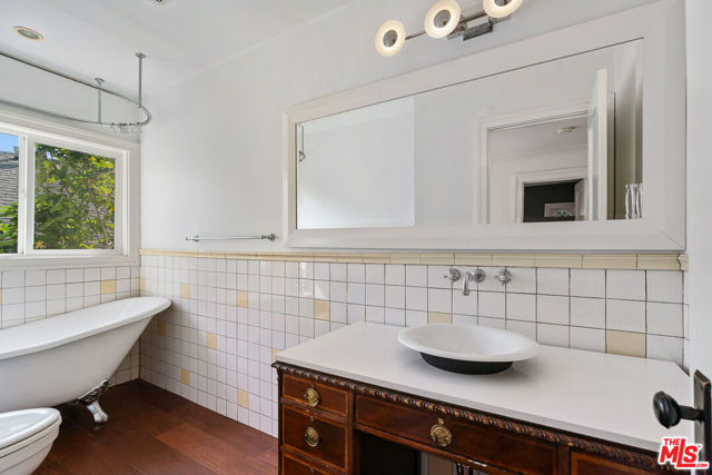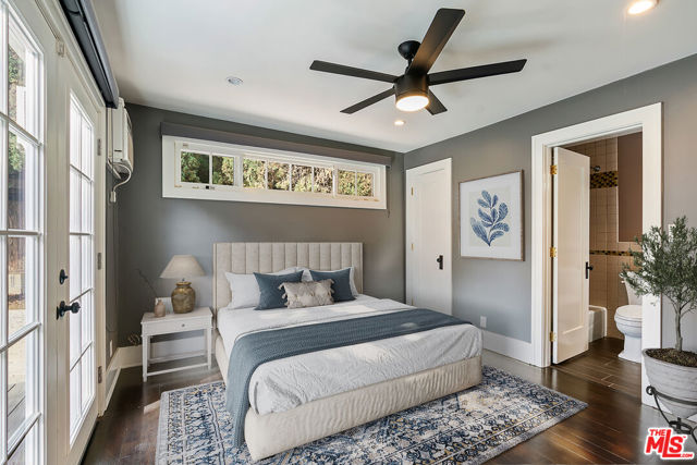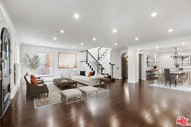 Gorgeous and grand Colonial style home set in historic Melrose Hill! Nearby you have some of the hottest restaurants and coffee shops the city has to offer including Ggiata, Cafe Telegrama, Little Fish, L.A. Grocery & Cafe, Bar Etoile, Etra, Maison Matho, Goop Kitchen, and more! The grand front porch welcomes you to the open living and dining area, as well as a spacious kitchen with new shelving and its own dining area or den. Just off the kitchen you have a downstairs bedroom with an en suite bath, perfect for guests or a home office! Up the stunning oak staircase and on the second floor you will find three spacious bedrooms, one which has its own private deck and another that has a modern, en suite bath. The property has been meticulously maintained, offering newer appliances, refinished hardwood floors, fresh paint, and beautiful landscaping. The large yard is great for entertaining or relaxing and offers an oversized garage that can even be used for a home office, home gym or art studio. The gated driveway (with an automated gate) ensures you have plenty of off-street, secure parking. Melrose Hill is a historically preserved neighborhood, so it's incredibly charming with easy access to the 101, Larchmont Village, and more! Photos are digitally staged. 24 hour notice required - alarm on property and currently occupied. *One of bedrooms upstairs does not have a closet, but wardrobe could be added.