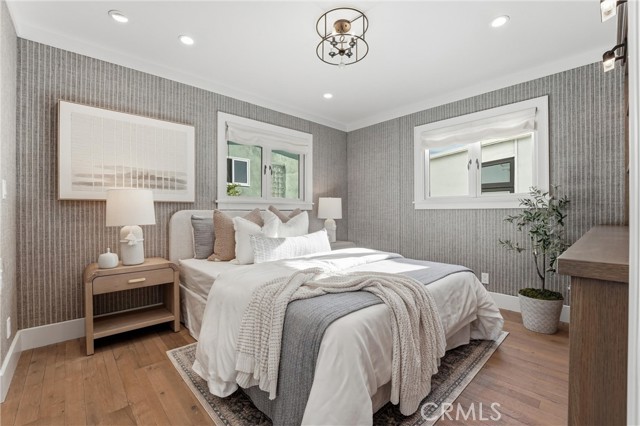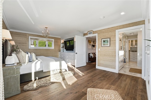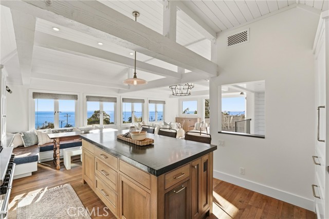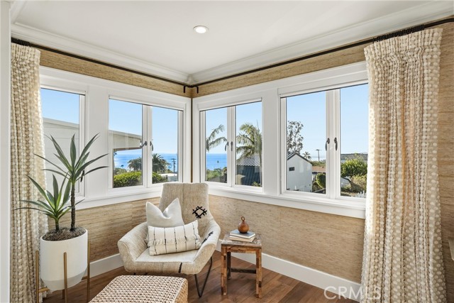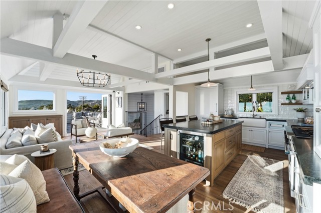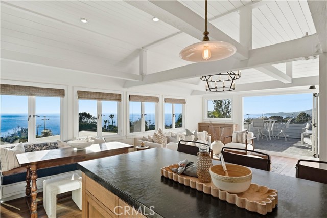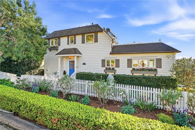 Just several blocks from the sands of world class beaches, this exceptional ocean-view coastal cottage blends timeless elegance with relaxed Laguna Beach living. Remodeled by award-winning designer Andra Miller, the home pairs classic East Coast charm with elevated California style and beautiful views of the Pacific coastline, creating a residence that feels both refined and relaxing. Approximately 2,200 square feet, the 3 bedroom, 3 1/2 bath residence features a thoughtful split-level layout that maximizes light and privacy, living far beyond its footprint with warmth, character, and intention at every turn. The entry level includes the primary suite, secondary bedroom with custom bookshelves and private bath, and a laundry room. The lower level offers a private guest suite with a private bath, Douglas fir–lined walk-in closet, and direct garage access. A spacious 2-car garage with storage cabinets provides added convenience and functionality. The primary bath is a spa-inspired bath with freestanding soaking tub, heated marble flooring, dual vanities, walk in closet and a steam shower. Beautiful ocean views from the primary Bedroom. The top floor includes a designer kitchen open to the living and dining areas and features a soapstone island, custom cabinetry with glass uppers, farmhouse sink, custom banquette, built in beverage refrigerator and premium appliances including a six-burner Wolf range with griddle and a Sub-Zero refrigerator with dual temperature drawers. There is also direct access to your private deck providing indoor outdoor living. Ocean, Catalina Island and north coast views command this part of the house, making it an unforgettable setting for both quiet mornings and sunset gatherings. Refined details throughout include French oak floors, custom built-ins, crown molding, marble-appointed baths, designer tile, custom storage and cabinetry and curated lighting, all thoughtfully selected to elevate the home’s coastal aesthetic. Moments from the world class beaches, fine dining, and many of our cultural galleries, public art exhibits, and village shops, this is not just a home but it is a rare opportunity to experience the very best of Laguna Beach living.