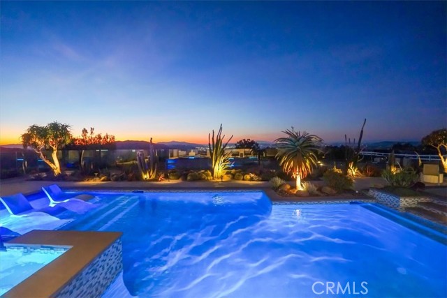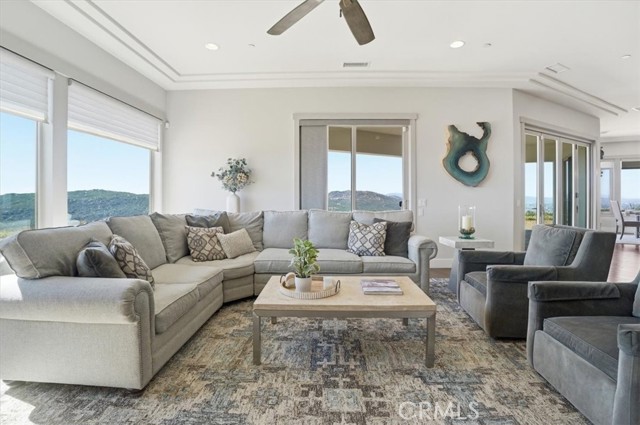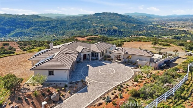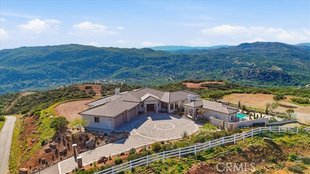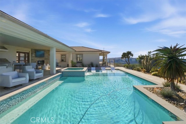 MUST SEE…Perched atop the rolling hills of the gated, hidden-gem Rancho Heights community, this stunning single-story 3-bedroom with den (4th bedroom option), 4.5-bath estate captures panoramic mountain, valley, city-light, and sunset views from every angle. Set on an expansive private lot, the home blends spacious indoor living with tranquil, resort-style outdoor amenities, creating a true retreat just minutes from Temecula and wine country. The open, light-filled layout features generous living and dining spaces, 10-foot-high ceilings, and picture windows framing the dramatic vistas. A large den serves perfectly as a 4th bedroom option, home office, or media room. Each bedroom includes its own en-suite bath and sliding door to a private patio, offering exceptional comfort and privacy for family and guests. A standout highlight is the impressive pool pavilion, fully fenced with glass to maximize views, complete with a steam-shower bathroom, covered outdoor kitchen, and fireplace—ideal for entertaining and delivering an authentic resort-living experience. The property also offers ample space for a future ADU. Designed for year-round enjoyment, the outdoor setting includes a sparkling pool, large spa, expansive patios, and multiple view decks overlooking the surrounding hills and twinkling city lights. Located within a private, gated enclave known for its large parcels and serene natural setting, this home offers a rare combination of privacy, space, and breathtaking scenery—all within easy reach of shopping, dining, and freeway access.