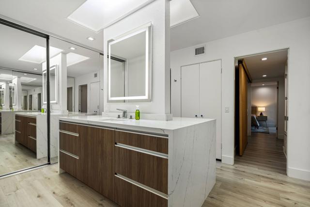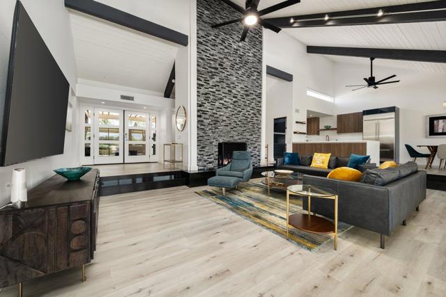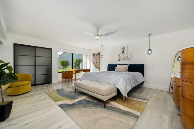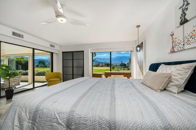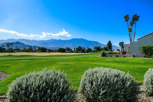 Welcome to Mission Hills Country Club living at its finest. This beautifully updated residence offers spectacular, unobstructed views of the San Jacinto Mountains and the sweeping fairways of the famed Dinah Shore Tournament Course an idyllic backdrop for desert luxury. Inside, the home has been reimagined with gorgeous custom cabinetry throughout, sleek quartz countertops, and a stunning waterfall-edge quartz island that anchors the contemporary kitchen. Newer windows and sliding glass doors frame the panoramic views while enhancing energy efficiency and natural light. Modern comfort continues with a newer HVAC system, updated water heater, and thoughtful contemporary finishes in every room. Motorized shades--both inside and on the rear patio--allow you to transition seamlessly from bright desert days to soft, ambient evenings. Step outside to an expansive patio designed for effortless indoor-outdoor living, perfect for morning coffee, sunset cocktails, or watching golfers play through.