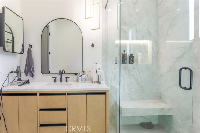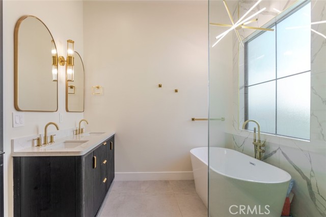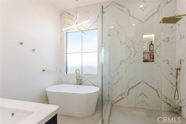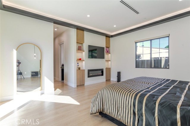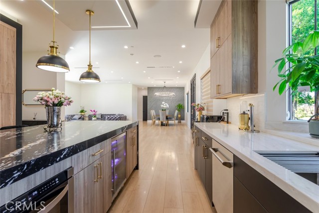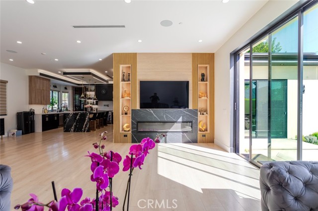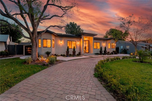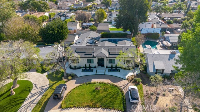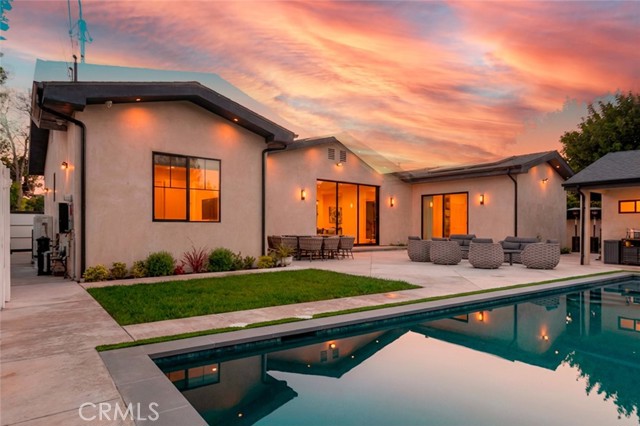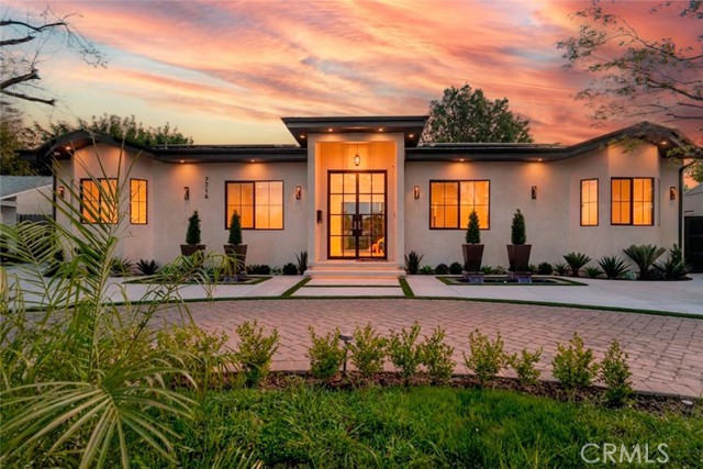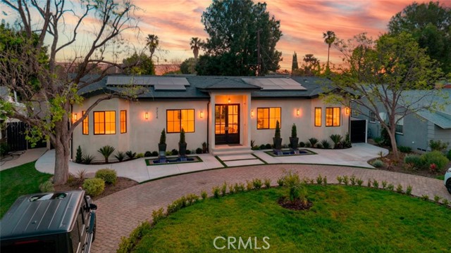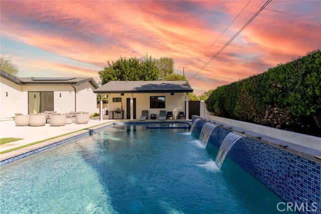Discover refined luxury living in this newly rebuilt home located in Northridge. Thoughtfully designed with modern elegance, this stunning residence offers 3 bedrooms, 4 bathrooms, and approximately 2,267 sq ft of beautifully crafted living space. The interior showcases soaring high ceilings, recessed lighting, and a stylish fireplace that creates a warm yet sophisticated atmosphere. The brand-new gourmet kitchen is designed for both everyday living and entertaining, featuring top-of-the-line appliances, sleek quartz countertops, and contemporary finishes. The outdoor space is a true private oasis, complete with a sparkling pool and spa, ideal for relaxing or hosting gatherings. Lush surroundings and a serene setting create a resort-style experience right at home. Additional highlights include a detached two-car garage, energy-efficient solar panels, and an elegant circular driveway providing convenient drive-in and drive-out access while enhancing the home's impressive curb appeal.