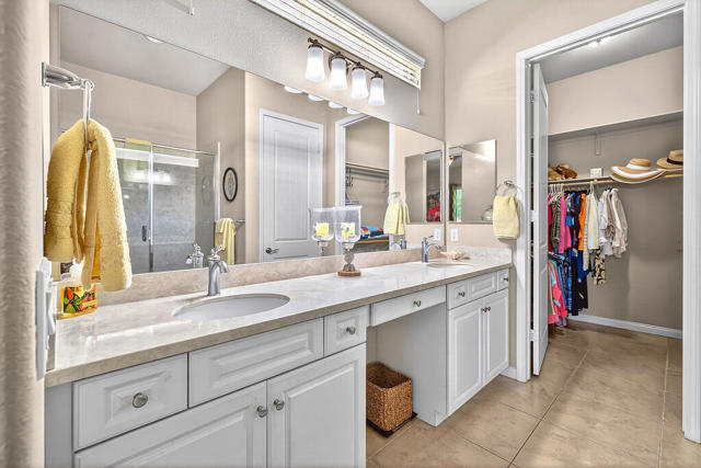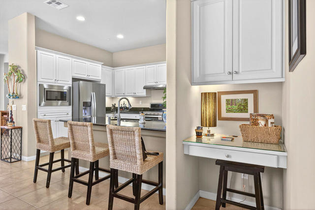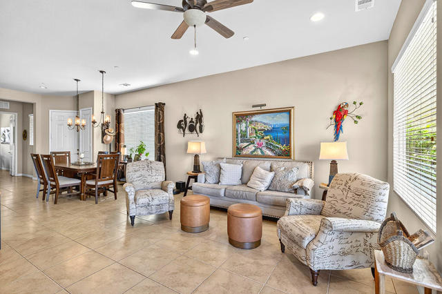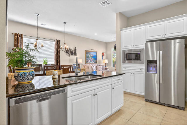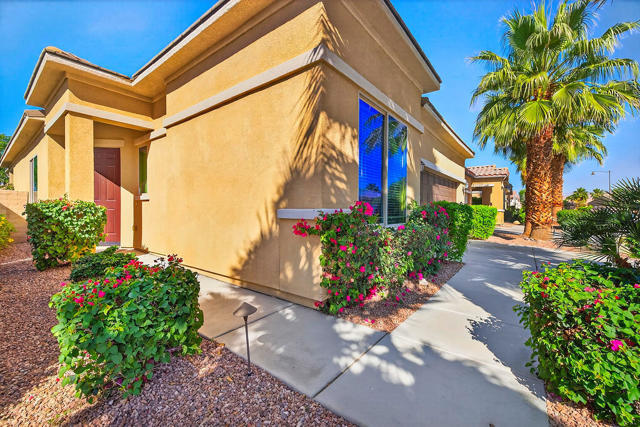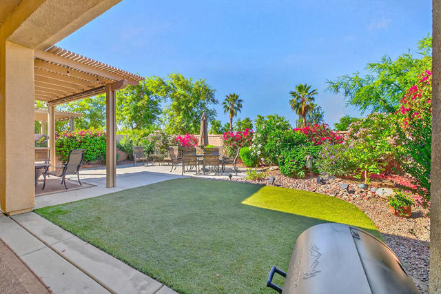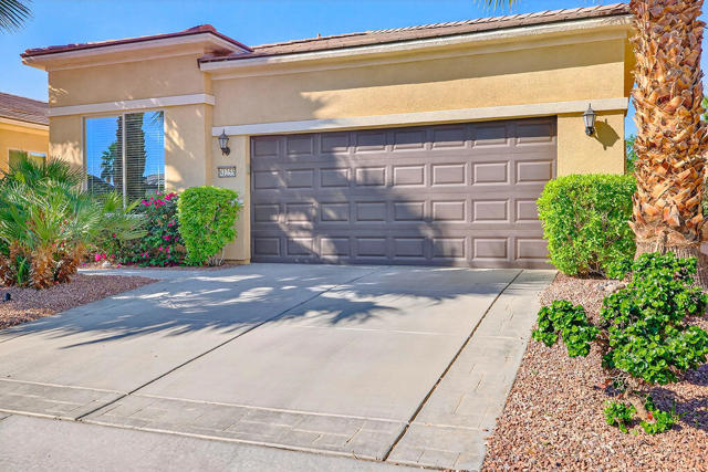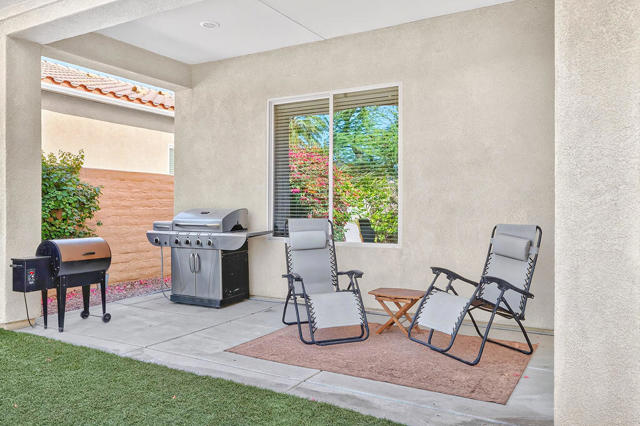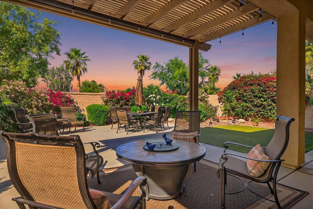 Experience the active lifestyle of Sun City Shadow Hills in this 2 bedroom/2 bath home and enjoy stunning sunsets from your beautifully landscaped yard, just a short walk from the resort-style amenities of the Santa Rosa clubhouse, state of the art fitness center, majestic pool and spa, tennis and pickleball courts, championship golf and even a dog park. This home boasts 1,321 sf of design features you're looking for and expect such as large open living and dining areas; extra high ceilings; a breakfast bar and pantry; newer upgraded appliances; a large primary bedroom flooded with natural light and a spacious bathroom with double sinks, an oversized shower, and a walk-in closet; a separate laundry room with plenty of storage; and direct access to a fully finished two car garage. This popular Embark plan has the second bedroom and bathroom located in the front portion of the home for more separation and privacy. The professionally landscaped front and back yards show off a variety of desert design features and lighting, highlighted by a very large patio area with extended shade cover, ample high quality furniture, plus a Char-Broil gas grill and Traeger smoker. Sun City Shadow Hills is a smartly designed Del Webb 55+ community with full resort amenities including multiple clubhouses with fitness centers, indoor and outdoor pools, racquet sports, and cafes; Shadows Restaurant & Bar; two challenging golf courses; guard gated security and patrol; and even lower cost Imperial Irrigation District electric utility. Shadow Hills is close to shopping, dining, entertainment and all world class events and recreation throughout the Coachella Valley for enjoying your perfect desert lifestyle.
