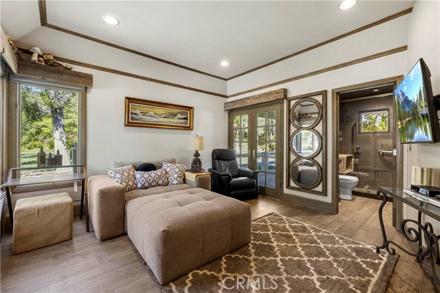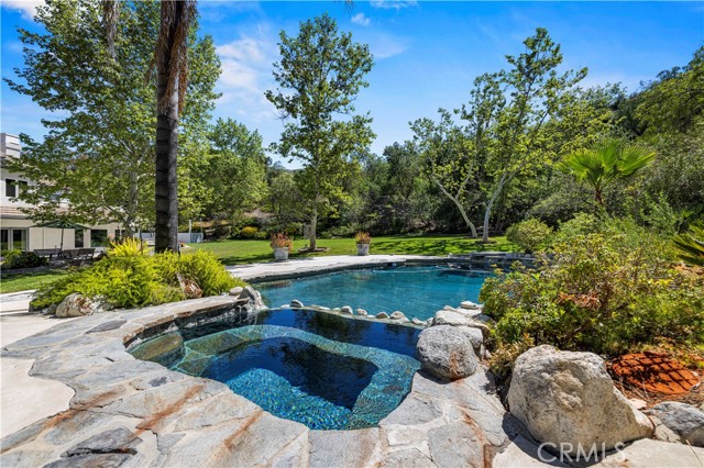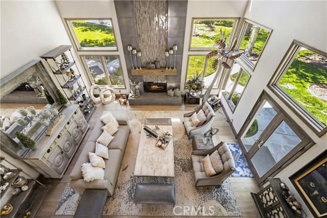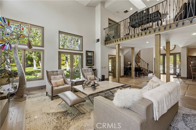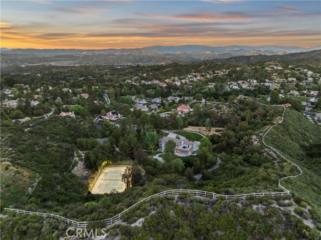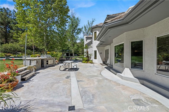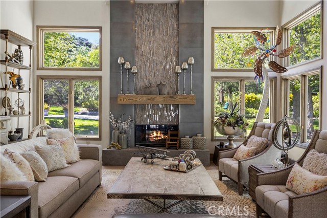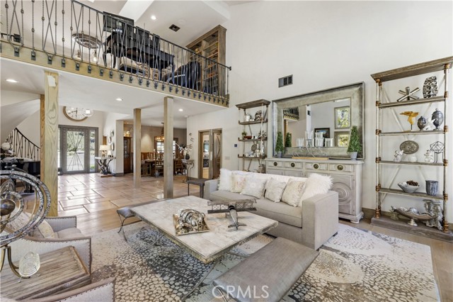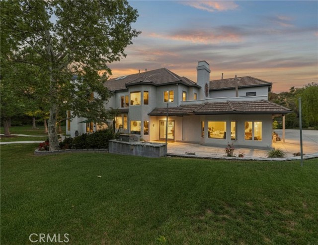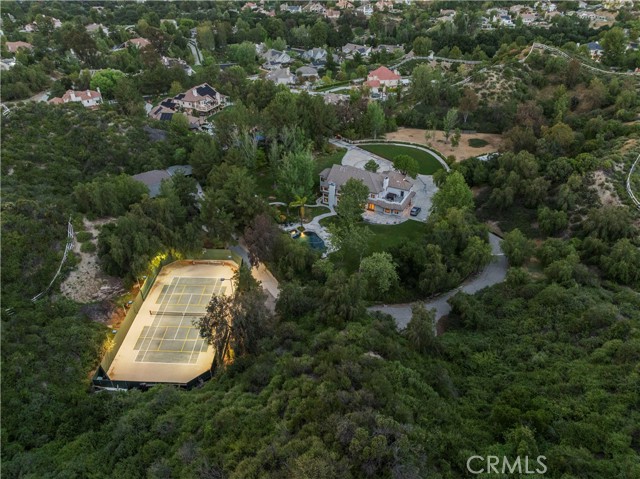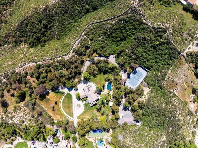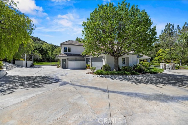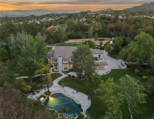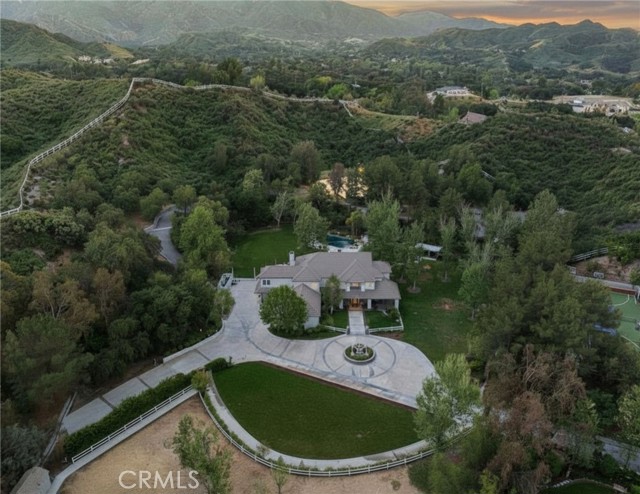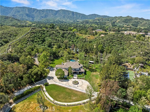 Welcome to your dream home in the prestigious Sand Canyon neighborhood! This California contemporary estate offers 5,134 sq ft of living space on a nearly 9-acre private and fully fenced property with serene mountain views. The gated drive leads to a grand circular driveway featuring a centerpiece fountain. A gorgeous custom metal front door opens into a sun-drenched great room with soaring ceilings, oversized windows, double doors leading outside, and a stunning custom statement fireplace, perfect for gathering or effortless entertaining. The formal dining room flows seamlessly from the main living space. The main level includes two well-appointed ensuite bedrooms with custom built-ins. The chef’s kitchen is a true showpiece with a soapstone island, natural stone countertops, and custom cabinetry all opening seamlessly to the breakfast nook and family room. Enjoy the 6 burner Dacor range, double ovens, dual refrigerator/freezer, steamer and generous pantry storage. The expansive family room features exposed beams, a custom feature wall, an architectural fireplace with extended hearth, and a bay window seat. Upstairs, an airy loft overlooks the great room. The primary suite is a private sanctuary with a fireplace, balcony views, and a sun patio with above-ground spa. A generous walk-in closet leads to a flexible bonus room. The ensuite bath offers dual vanities, a separate soaking tub, steam shower with rainfall feature and towel warmer, plus a laundry chute for added convenience. There are three additional bedrooms on the second floor, including one en-suite. Outside, enjoy a sprawling lawn, resort-style pool and waterfall spa, built-in BBQ, and a sport court lined for basketball and pickleball. A detached workshop/5-car garage, RV electrical hookup, and generator system (with potential backup to the main house) complete this exceptional property. Whether you’re dreaming of unforgettable gatherings, space for hobbies and toys, or a true retreat surrounded by nature, this property delivers a rare lifestyle in an exclusive neighborhood!