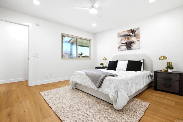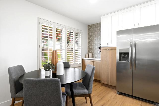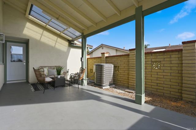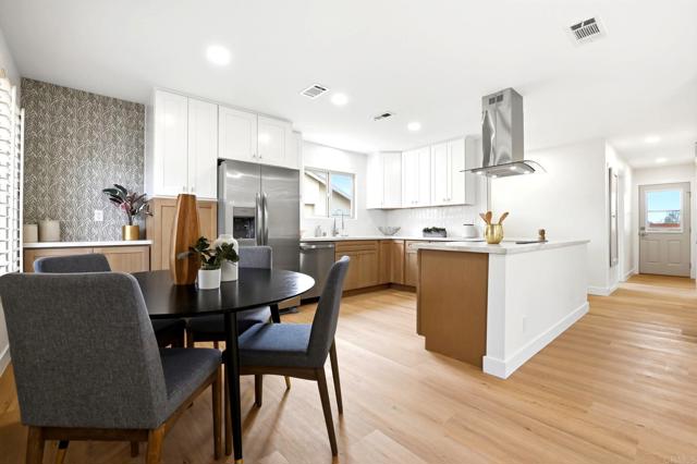 Tucked within the peaceful 55+ Oceana Mission community in Oceanside, this beautifully remodeled home offers a fresh start with style, comfort, and effortless coastal living. From the moment you step inside, you’re greeted by a bright, open living space where natural light pours through large windows, enhanced by elegant plantation shutters and brand-new LVP flooring that flows seamlessly throughout. The heart of the home is a thoughtfully updated kitchen, featuring new countertops, a sleek tile backsplash, and striking two-tone cabinetry, all complemented by stainless steel appliances. Designed for both everyday living and entertaining, it opens seamlessly to the dining and living areas, creating a warm and connected space to gather. The spacious living room invites you to unwind, while the primary suite offers a private retreat with its own ensuite bathroom, complete with dual sinks and a beautifully custom-tiled walk-in shower. A generously sized secondary bedroom and an updated guest bathroom provide comfort and flexibility for family or guests. Step outside to a large covered patio, where a newly added wooden fence facade creates a sense of privacy, perfect for morning coffee, evening relaxation, or hosting friends. Additional conveniences include a one-car garage with washer and dryer hookups. Set within a quiet, well-maintained community featuring a pool and clubhouse, this home is ideally located just minutes from the beach, with easy access to freeways, shopping, schools, and parks, bringing together the best of coastal convenience and everyday tranquility.