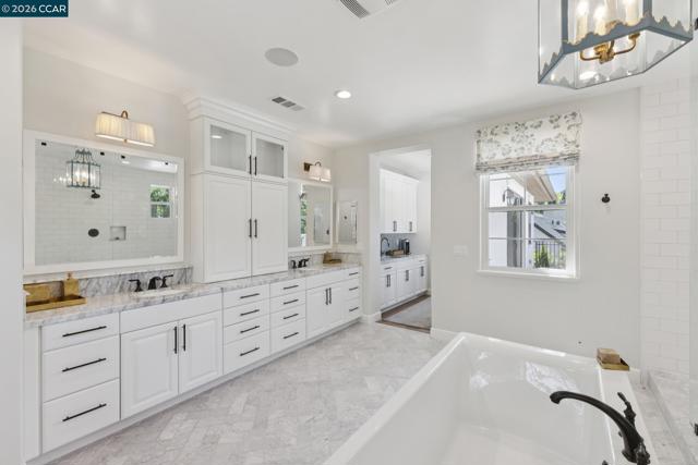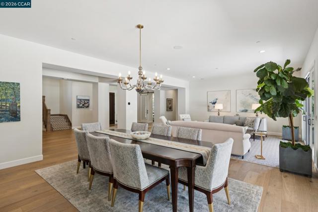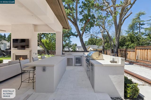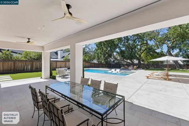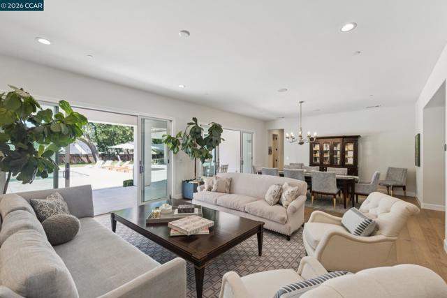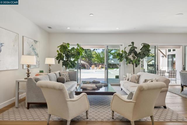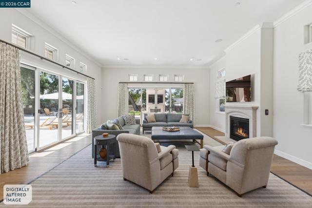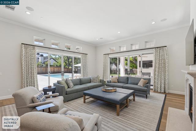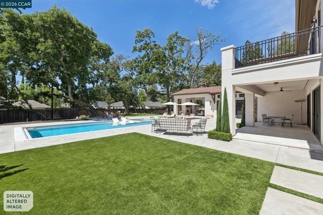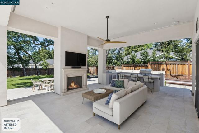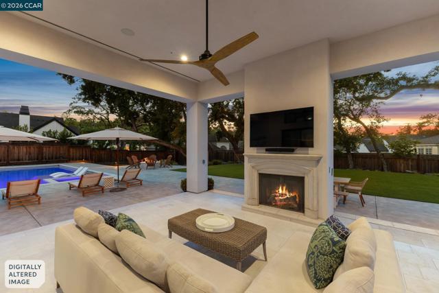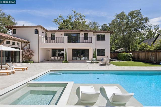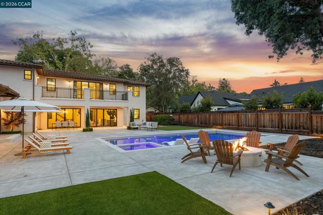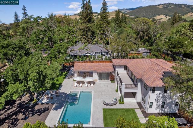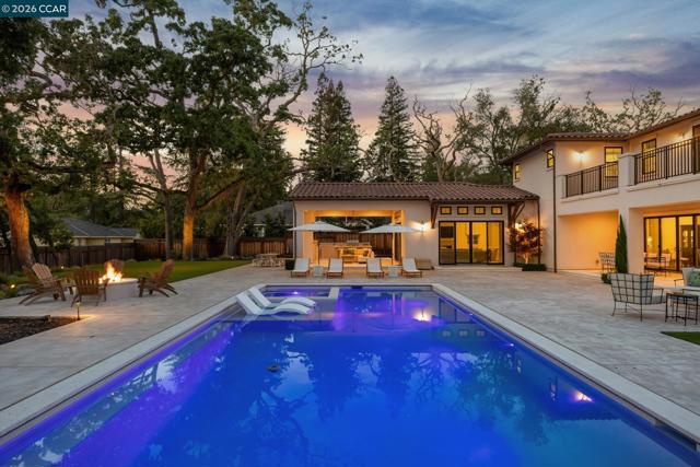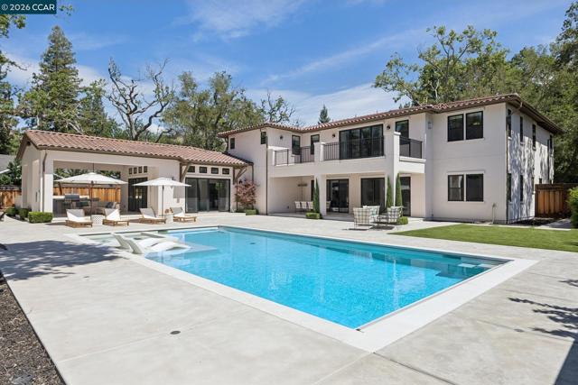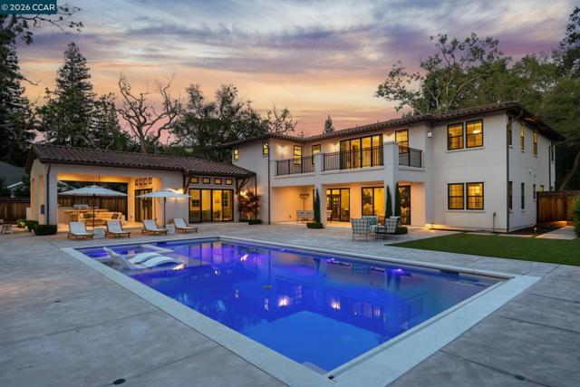 Mediterranean-inspired estate built in 2022 on a level .64-acre lot in a desirable lower Diablo location. Approx. 6,141 sq ft featuring 5 en-suite bedrooms and 5.5 bathrooms. Main level includes living and dining room with fireplace, open kitchen/family room with upgraded appliances (incl. wine refrigerator), office, wine room, and two en-suite bedrooms. Large glass doors provide seamless indoor/outdoor flow to resort-style backyard. Upper level offers two en-suite bedrooms, bonus area, and spacious primary suite with private deck, large walk-in closet, and luxurious bath. High-end finishes throughout including Calcutta and Carrara marble, titanium travertine, quartzite, and 100% natural white oak Provenza flooring. Backyard features pool/spa, outdoor kitchen, loggias with fireplace, bocce court, firepit, expansive lawn, and 20x40 artificial turf sport court. Exceptional property offering privacy, modern amenities, and ideal indoor/outdoor living. Start living the Diablo lifestyle.