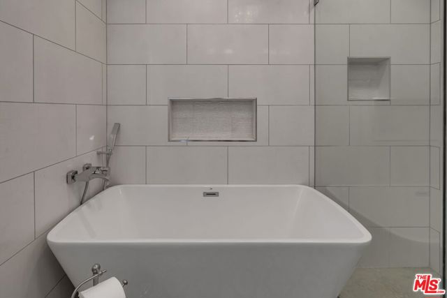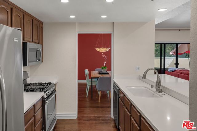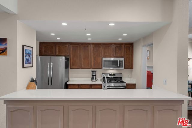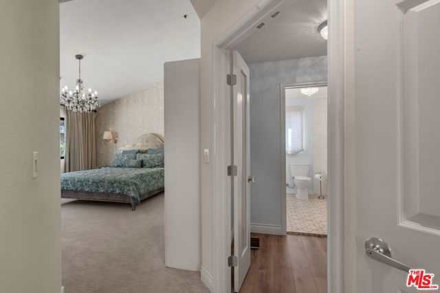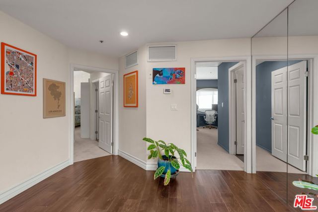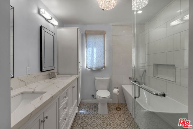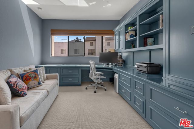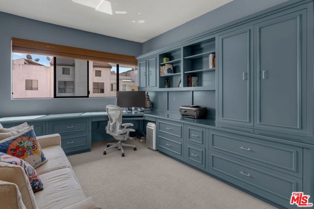 Top-floor corner condo with great natural light, soaring ceilings, and no units above creating a quiet, airy feel that lives like a private retreat. The open living, dining, and kitchen areas flow seamlessly out to an amazing oversized private sunny patio, perfect for entertaining or dining al fresco. Thoughtfully upgraded with quartz countertops, designer flooring, and custom window treatments. Both bedrooms are en-suite, including a spacious primary with a remodeled bath and walk-in closet. The second bedroom doubles as a beautifully designed office/guest suite, complete with custom built-ins. Additional highlights include in-unit laundry and two parking spaces. This cheerful unit is a bright, well-designed space with elevated finishes throughout - truly an emotional property, located just a block from the shops and restaurants on Westwood Blvd.