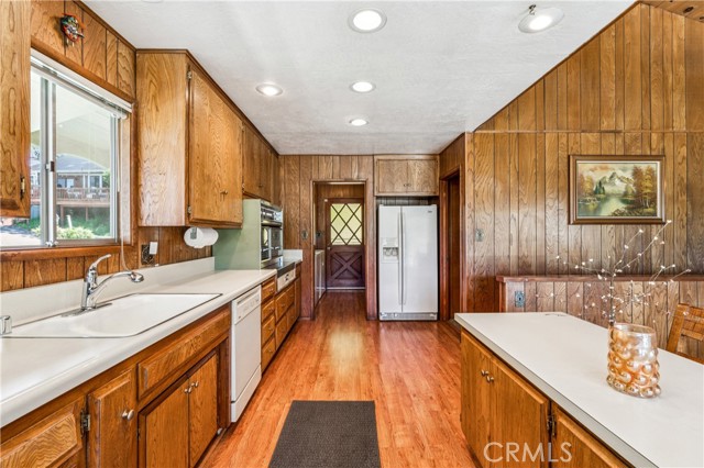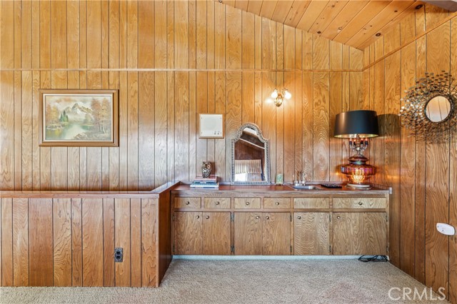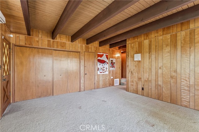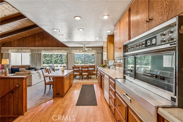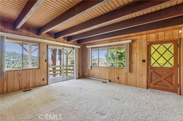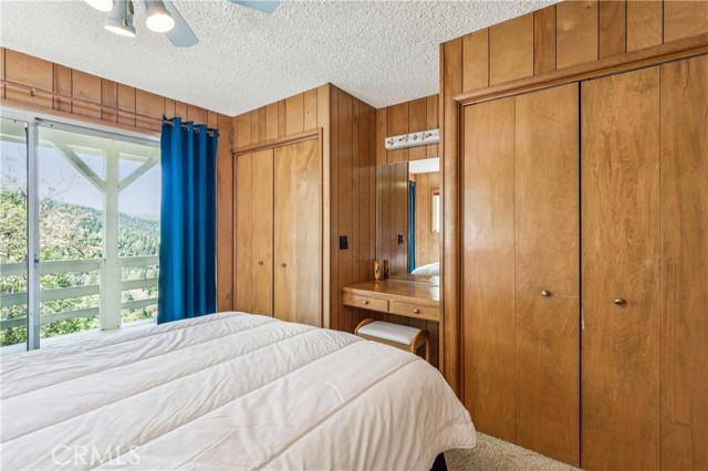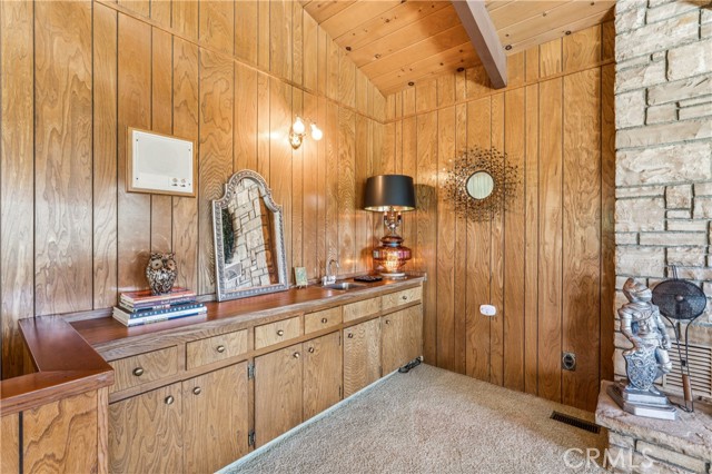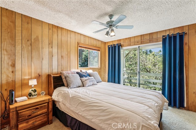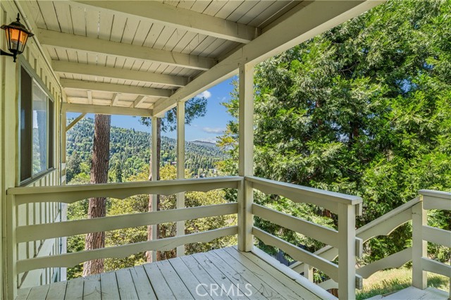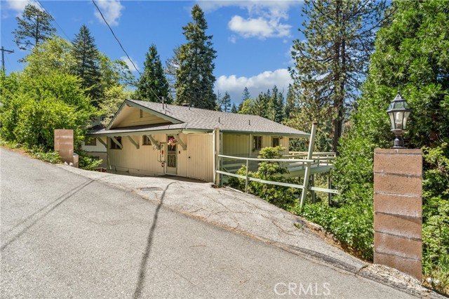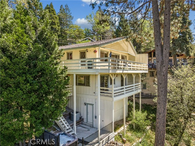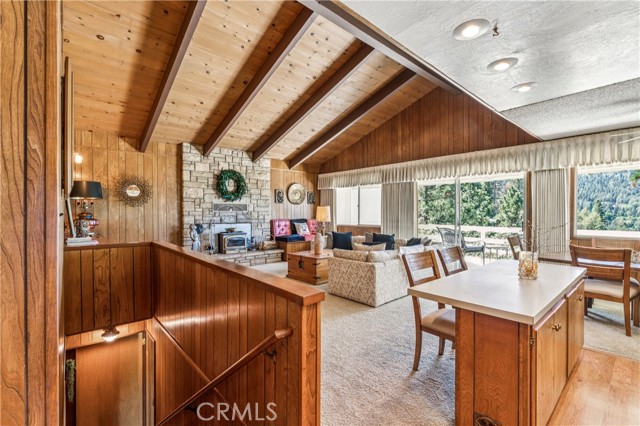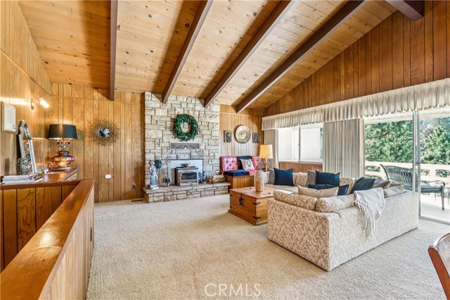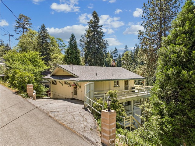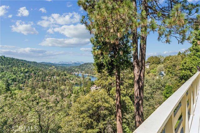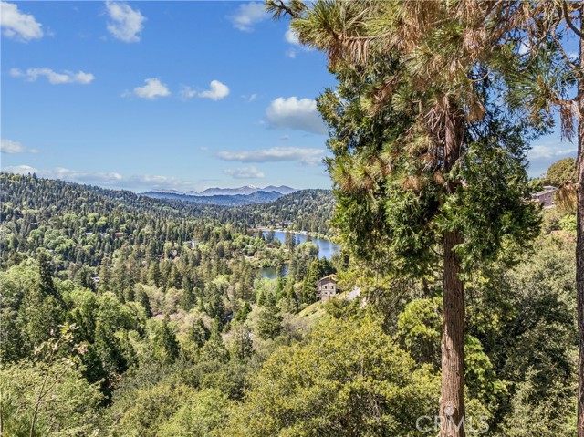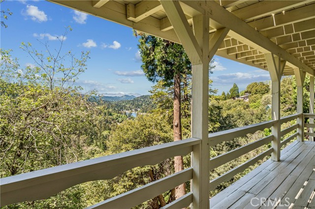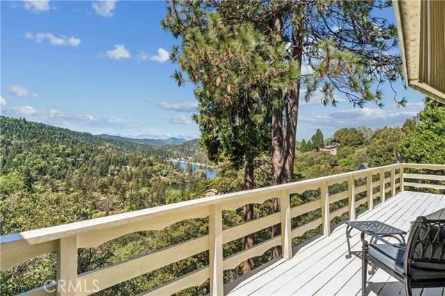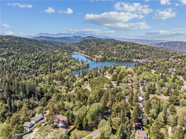 If Don Draper ever escaped to the mountains, this would have been his retreat. With sweeping views of Lake Gregory, this midcentury gem blends timeless design with modern comfort. Three separately deeded lots provide space and privacy, surrounded by whispering pines and calm mountain breezes. Inside, the glow of afternoon light highlights wood paneling and beamed ceilings, capturing the warmth and refinement of a classic era. The open living room features a striking natural stone fireplace and a built-in wet bar, ideal for gatherings, quiet reflection, or creative inspiration. Sliding glass doors open to an expansive wraparound deck with panoramic lake views, perfect for indoor-outdoor living. Downstairs, both bedrooms open to a second deck and a bubbling hot tub, offering a peaceful escape under the stars. A spacious workshop with interior and exterior access provides excellent storage and space for inspired projects. Upgrades over the past few years include a new roof, repainted decks, refreshed terraced landscaping with laurel bushes, a modernized bathroom, leased solar panels, and updated central heating and air. Additional features like a security system, commercial-grade sprinklers, and lockable gates add peace of mind. A home where design meets comfort, this property feels both classic and current - imagine Peggy sketching ideas by the window, Roger appreciating the view, or Joan hosting with effortless grace. Light a fire, pour a drink, and settle into the kind of California cool that never goes out of style.