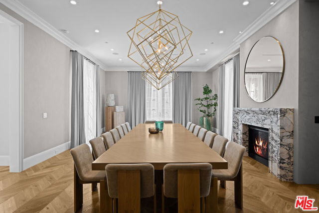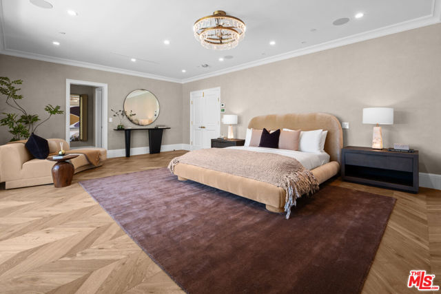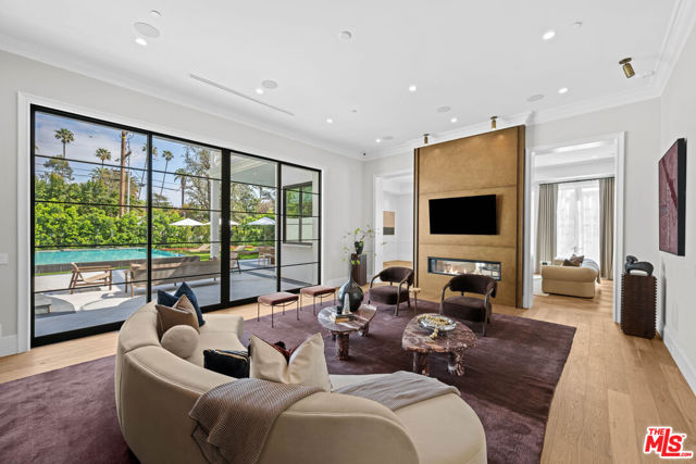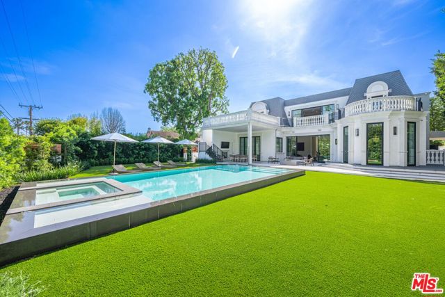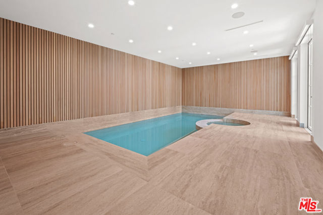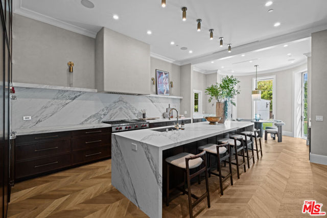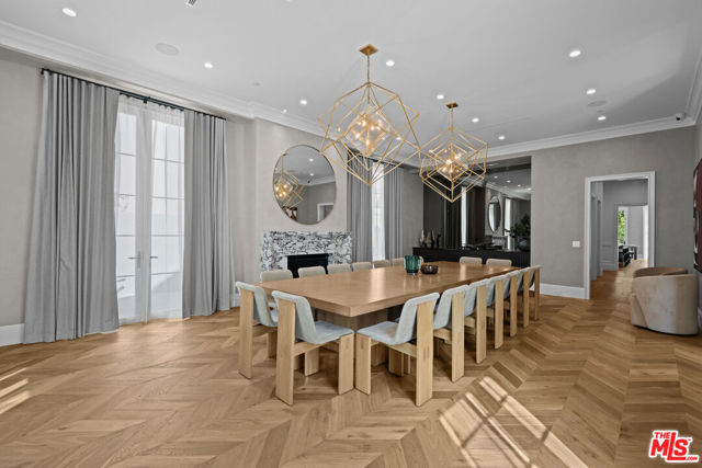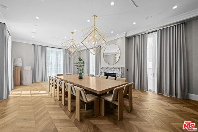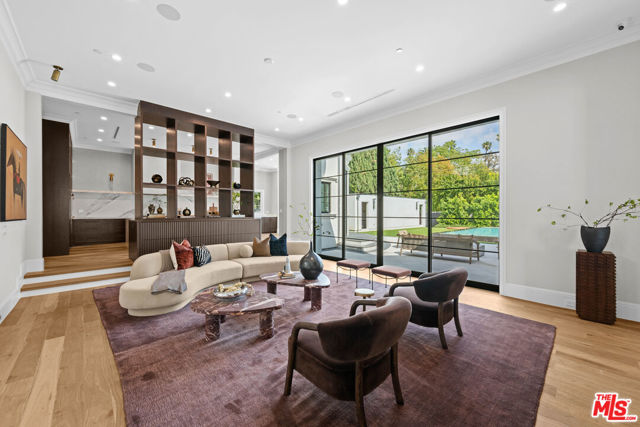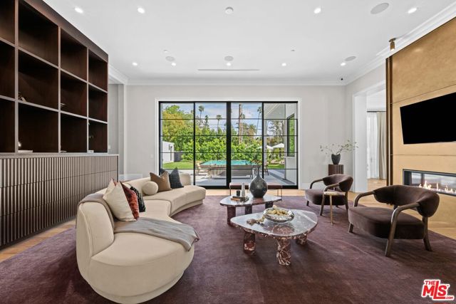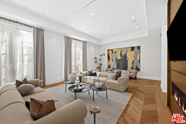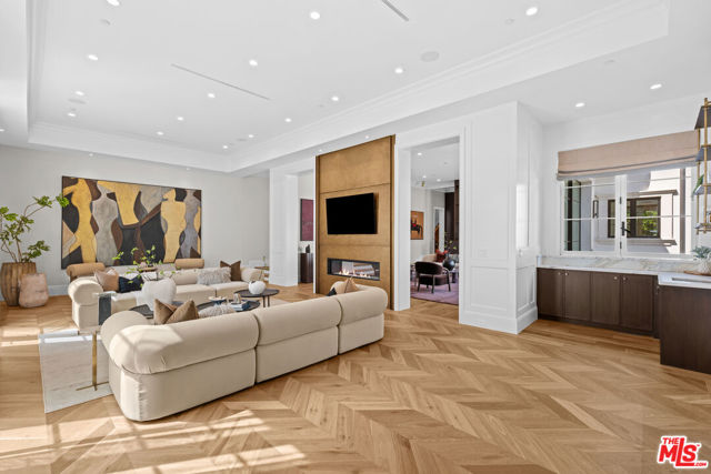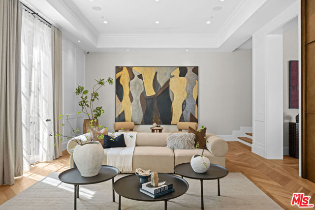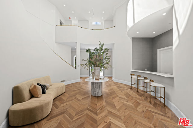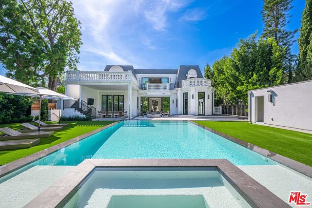 Newly built and fully furnished, this extraordinary Beverly Hills estate spans over 14,000 square feet across three levels, offering 8 bedrooms, 12 bathrooms, a private elevator, and a gated subterranean 10-car garage. A dramatic bridge entry creates a striking sense of arrival, while also allowing natural light to cascade into the lower level below. Defined by architectural elegance and exceptional custom craftsmanship, the home features select white oak flooring, Venetian plaster walls, bespoke lighting, a grand staircase, and a dramatic skylight. The formal dining room and showpiece kitchen are finished in exquisite Calacatta Viola stone, with the kitchen further appointed with Sub-Zero refrigeration, Wolf appliances, a Waterstone faucet, and custom cabinetry throughout. Thoughtfully designed for both refined entertaining and comfortable daily living, the residence includes a formal living room with bar, a den with a see-through fireplace, a richly finished paneled office, theater, and expansive lower-level entertainment spaces. All eight bedrooms offer en-suite baths and closets, including a stunning primary suite with dual bathrooms, dual walk-in closets, and a large private patio. Outdoors, a beautifully symmetrical infinity pool and jacuzzi align with the home's central axis, complemented by an outdoor fireplace and beautifully designed terraces. With a second pool and jacuzzi on the lower level, curated furnishings, original art, and bespoke finishes throughout, this is a rare offering of scale, warmth, and modern luxury in one of Beverly Hills' most coveted settings.
