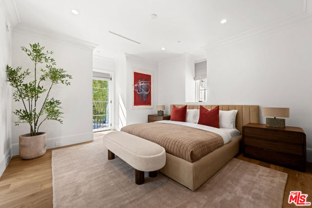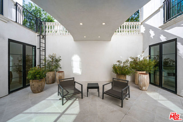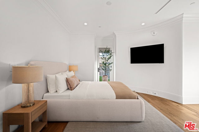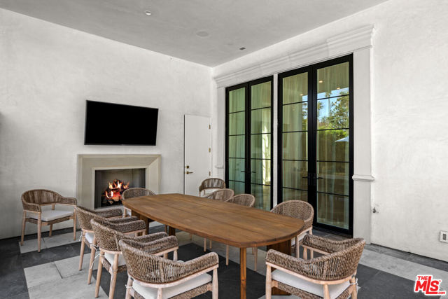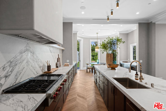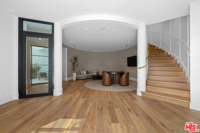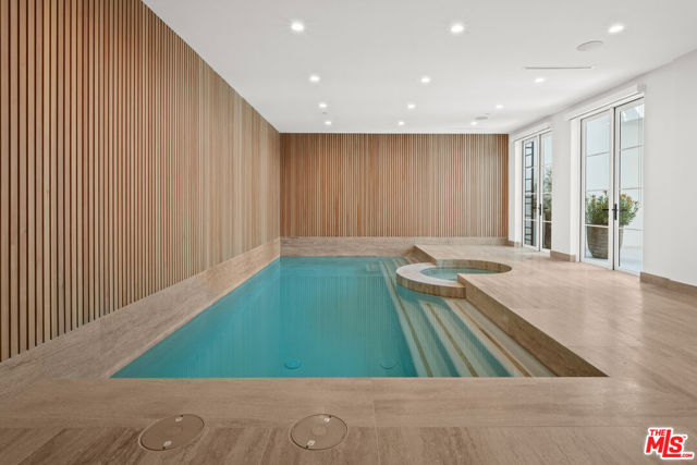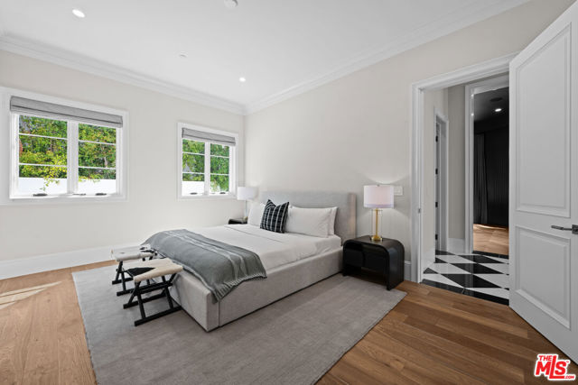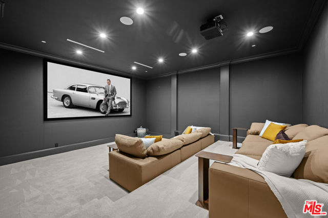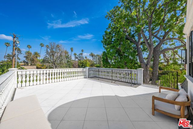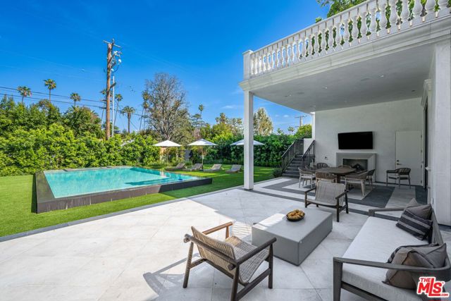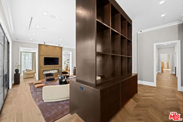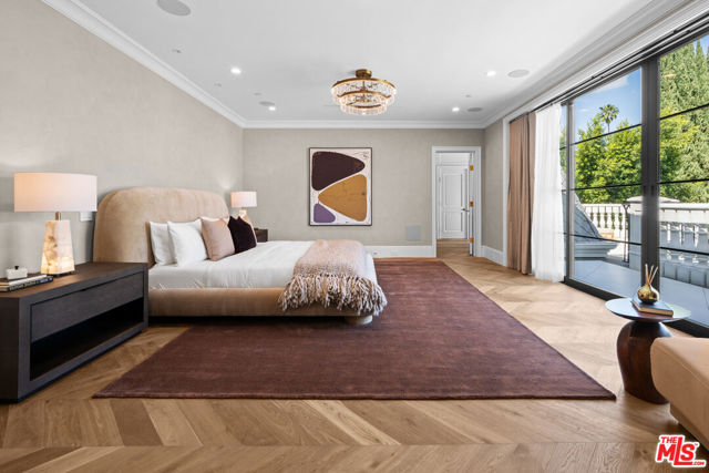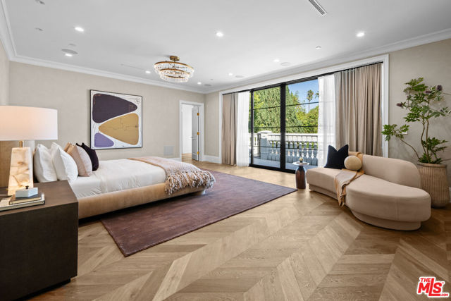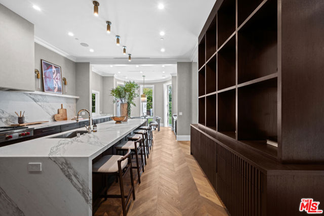 Newly built and fully furnished, this extraordinary Beverly Hills estate spans over 14,000 square feet across three levels, offering 8 bedrooms, 12 bathrooms, a private elevator, and a gated subterranean 10-car garage. A dramatic bridge entry creates a striking sense of arrival, while also allowing natural light to cascade into the lower level below. Defined by architectural elegance and exceptional custom craftsmanship, the home features select white oak flooring, Venetian plaster walls, bespoke lighting, a grand staircase, and a dramatic skylight. The formal dining room and showpiece kitchen are finished in exquisite Calacatta Viola stone, with the kitchen further appointed with Sub-Zero refrigeration, Wolf appliances, a Waterstone faucet, and custom cabinetry throughout. Thoughtfully designed for both refined entertaining and comfortable daily living, the residence includes a formal living room with bar, a den with a see-through fireplace, a richly finished paneled office, theater, and expansive lower-level entertainment spaces. All eight bedrooms offer en-suite baths and closets, including a stunning primary suite with dual bathrooms, dual walk-in closets, and a large private patio. Outdoors, a beautifully symmetrical infinity pool and jacuzzi align with the home's central axis, complemented by an outdoor fireplace and beautifully designed terraces. With a second pool and jacuzzi on the lower level, curated furnishings, original art, and bespoke finishes throughout, this is a rare offering of scale, warmth, and modern luxury in one of Beverly Hills' most coveted settings.