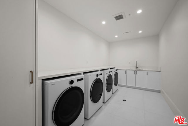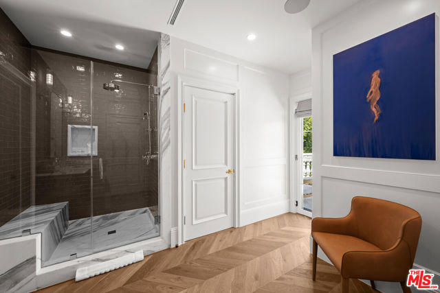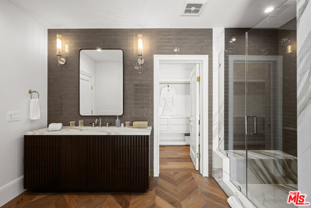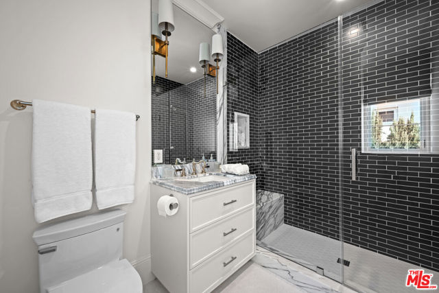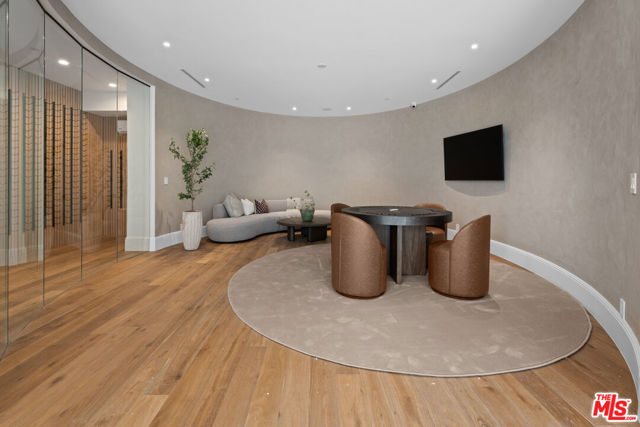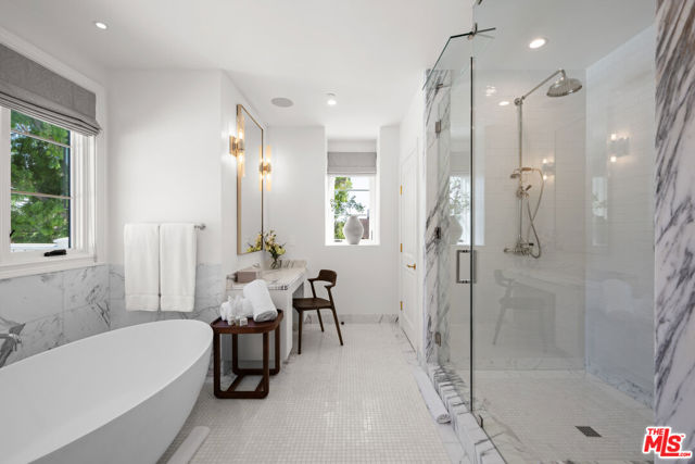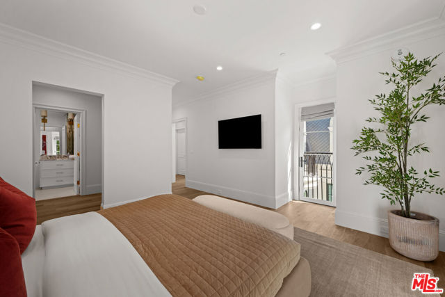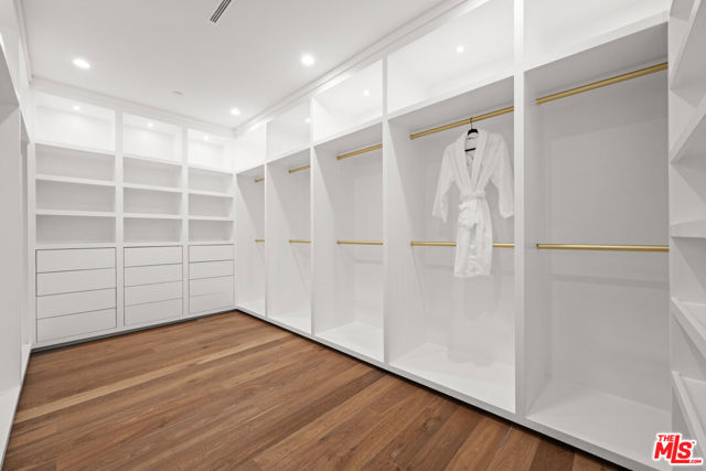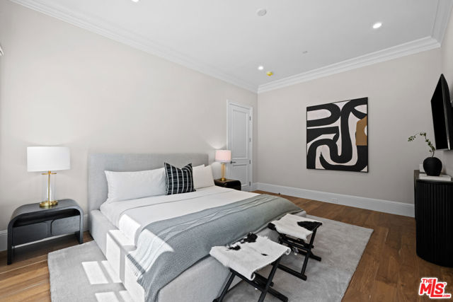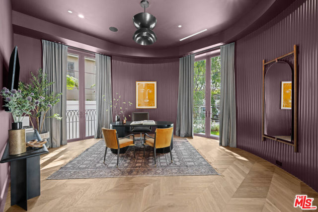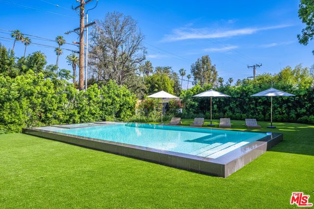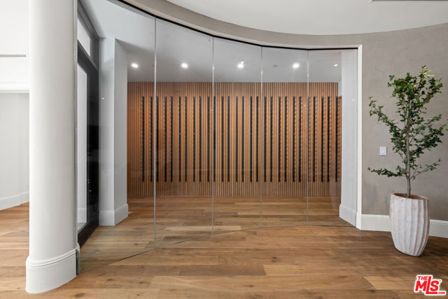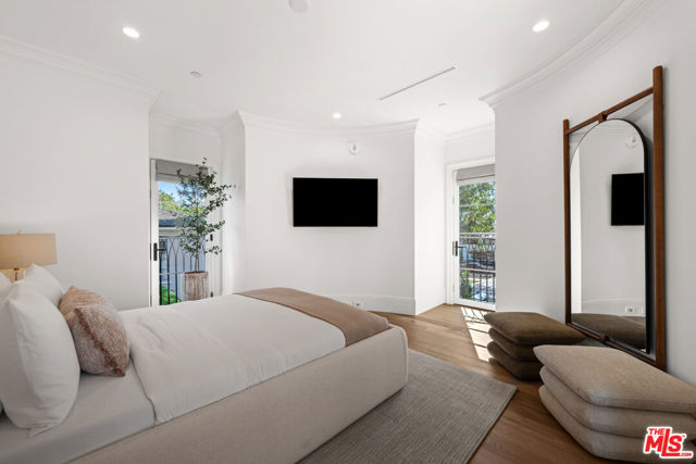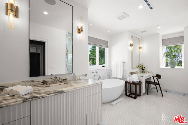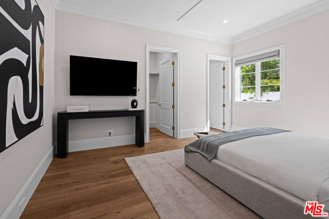 Newly built and fully furnished, this extraordinary Beverly Hills estate spans over 14,000 square feet across three levels, offering 8 bedrooms, 12 bathrooms, a private elevator, and a gated subterranean 10-car garage. A dramatic bridge entry creates a striking sense of arrival, while also allowing natural light to cascade into the lower level below. Defined by architectural elegance and exceptional custom craftsmanship, the home features select white oak flooring, Venetian plaster walls, bespoke lighting, a grand staircase, and a dramatic skylight. The formal dining room and showpiece kitchen are finished in exquisite Calacatta Viola stone, with the kitchen further appointed with Sub-Zero refrigeration, Wolf appliances, a Waterstone faucet, and custom cabinetry throughout. Thoughtfully designed for both refined entertaining and comfortable daily living, the residence includes a formal living room with bar, a den with a see-through fireplace, a richly finished paneled office, theater, and expansive lower-level entertainment spaces. All eight bedrooms offer en-suite baths and closets, including a stunning primary suite with dual bathrooms, dual walk-in closets, and a large private patio. Outdoors, a beautifully symmetrical infinity pool and jacuzzi align with the home's central axis, complemented by an outdoor fireplace and beautifully designed terraces. With a second pool and jacuzzi on the lower level, curated furnishings, original art, and bespoke finishes throughout, this is a rare offering of scale, warmth, and modern luxury in one of Beverly Hills' most coveted settings.