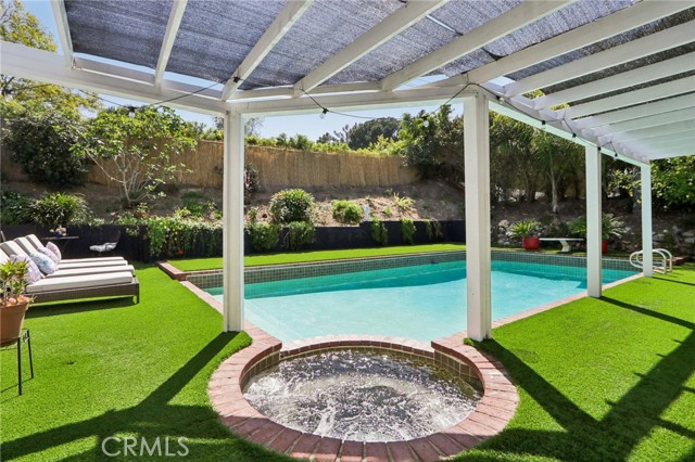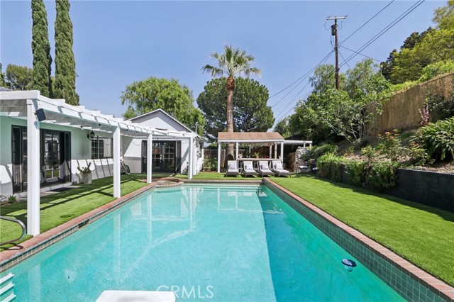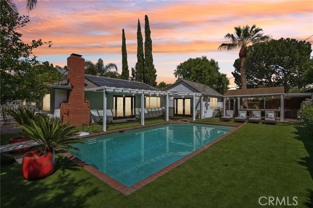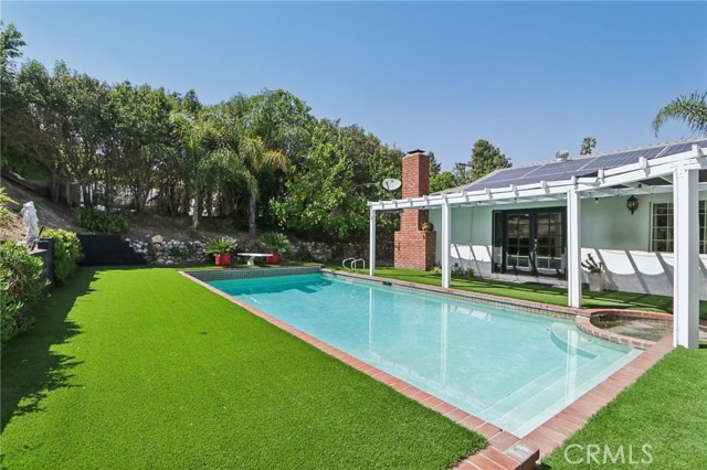 Welcome to this entertainer’s dream—a gated retreat nestled in the highly sought-after Granada Hills neighborhood, north of Rinaldi. From the moment you step inside, a serene private courtyard with a tranquil fish pond sets the tone, offering a peaceful, zen-like ambiance that flows throughout the home. This beautifully maintained residence features 4 bedrooms plus a dedicated office, 2 bathrooms, and just under 2,300 square feet of thoughtfully designed living space, all situated on an expansive nearly 11,000 square foot lot. The inviting living room is anchored by a cozy fireplace, perfect for relaxing evenings, while the spacious kitchen provides ample room for hosting and gathering. Designed with entertaining in mind, the oversized family room boasts soaring vaulted ceilings, a stylish wet bar with granite countertops, and large windows alongside French doors that flood the space with natural light and create seamless indoor-outdoor living. The primary suite offers dual closets and a private en-suite bathroom, delivering both comfort and functionality. Step outside to your own private oasis—an entertainer’s backyard complete with a sparkling oversized pool and spa, covered patio, lush landscaping, and a variety of mature fruit trees. It’s the perfect setting for hosting or simply unwinding in total privacy. Additional highlights include a solar system, newer roof, attached two-car garage with direct access, potential RV parking, and a prime location with convenient access to the 118, 405, and 14 freeways, nearby parks, and scenic hiking trails. Situated in a highly desirable neighborhood known for its excellent charter schools, this home truly has it all.