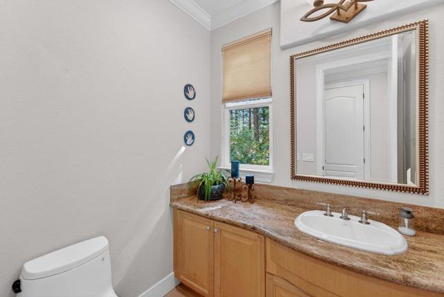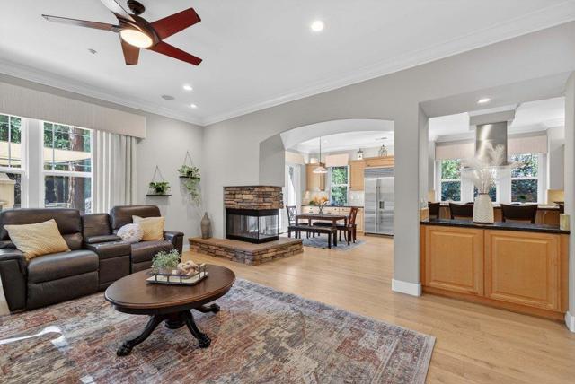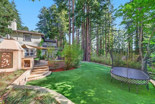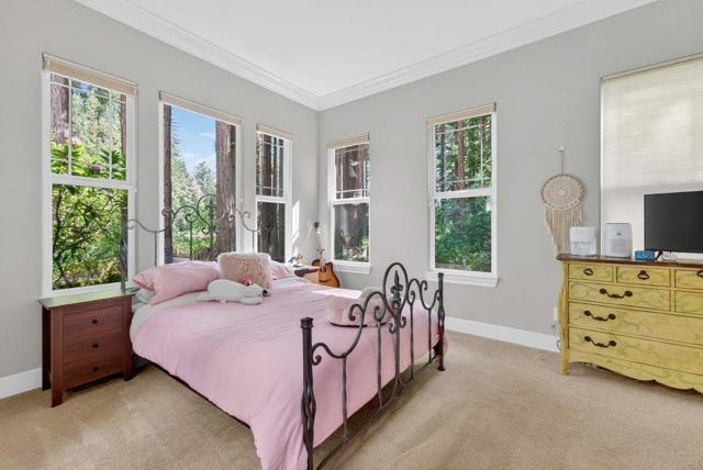 Welcome to WOODS COVE, one of Santa Cruz Countys most enchanting gated communities. Set on a 1/2 acre lot, this 5,530 sqft residence offers 4 en-suite bedrooms, including a ground-floor suite with direct courtyard access. Additional rooms provide an ideal space for an office, den, or creative retreat. Thoughtfully designed, the home features soaring ceilings, crown molding, and wide-plank European white oak hardwood floors. Every window frames a picturesque view of majestic redwood trees, creating a sense of privacy and nature living. The primary suite is a sanctuary with a walk-in closet, spa tub, fireplace, and sitting area. The chefs kitchen is ideal for living and entertaining, featuring a large island, Sub-Zero refrigerator, and Thermador double oven and cooktop. Outdoors, enjoy an entertainers haven with a bar, pizza oven, BBQ, turf, and spa. Discover serene nooks among mature redwoodsperfect for relaxing in nature. Your backyard extends into Henry Cowell Redwoods State Park for scenic hikes. A 3-car garage offers ample storage. With easy access to Highway 17 and Graham Hill, this home blends luxury, comfort, and convenience. Come experience the magic of 121 Palomino Waythis could be the one that captures your heart at first sight.