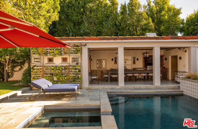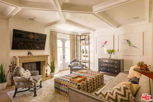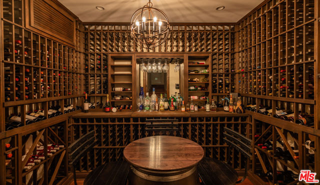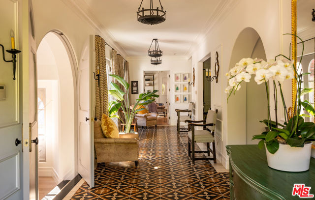 Steeped in Hollywood history and reimagined for contemporary living, this extraordinary 1928 estate was originally built by renowned Spanish Revival and Monterey Colonial architect Roy Seldon Price for Charlie Chaplin's second wife, with interiors crafted by legendary set designer Harold Grieve. Today, the residence stands fully remodeled and thoughtfully upgraded, preserving its storied past while embracing the finest modern amenities. Tall, mature hedges encircle the property, ensuring complete privacy the moment you enter through the double-gated drive. A long motor court leads to the main entry, framed by a grassy lawn, fruit trees, and a charming turtle pond beside a dedicated dog run.Inside, the home unfolds through a striking foyer appointed with Moroccan tiles, grand archways, Spanish lighting, and bespoke French doors. This central hall opens to an elegant sequence of entertaining rooms, all bathed in natural light and designed with effortless indoor-outdoor flow. The formal living room features a dramatic stone fireplace and extends to both the expansive backyard and the front garden courtyard. The room also features a built-in bar and lounge area, along with a library/office with garden access. A vintage-style powder room and vanity complete the formal wing. At the heart of the home lies the chef's kitchen, featuring Viking appliances, a walk-in pantry, generous central island, and breakfast bar. Set between the formal dining room and inviting family room showcasing coffered ceilings, bespoke wall treatments, stone fireplace, and a built-in banquette dining area - ideal for gatherings of any scale. Below, an incredible wine cellar and multiple storage rooms offer utility and temperature-controlled preservation.Upstairs, five bedrooms occupy the main level, three of which open to a wraparound balcony overlooking the gardens. The primary suite is a sanctuary unto itself, featuring a stone fireplace in the private sitting room, dual bathrooms with a soaking tub, generous walk-in closet, and private balcony with direct access to the pool terrace below. The family room opens through French doors to a covered terrace with views of the pool, spa, cold plunge, and a full outdoor kitchen and dining pavilion beneath iconic Beverly Hills palms. The backyard also boasts a spacious lawn with a detached one bedroom/bathroom pool house. A completely separate wing is accessed through the gated side driveway and two-car garage - perfect for guests or staff. This private suite includes a secondary office with its own bathroom, a fully outfitted mirrored gym, a dedicated laundry area, and two bedrooms with a shared bath and direct access to the backyard. An additional large laundry room sits adjacent for convenience.A rare, meticulously maintained estate in the Beverly Hills Flats - steps from the area's premier shopping, dining, and nightlife.