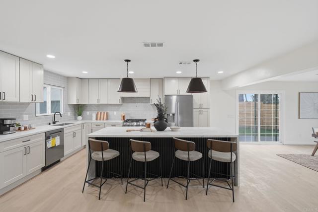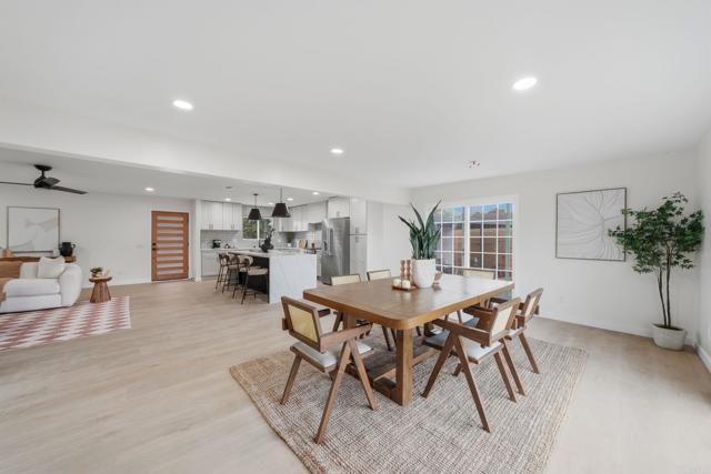 Welcome to this beautifully renovated single-level home in Linda Vista featuring 4 bedrooms and 3 full bathrooms on an expansive 9,800 sq ft premium canyon lot with private, serene views; fully remodeled, the home offers an open-concept layout with luxury vinyl plank flooring throughout and abundant natural light, complemented by dual pane windows and sliders; the updated kitchen features quartz countertops, new cabinetry, stainless steel appliances, and a spacious island ideal for entertaining, while the bathrooms have been upgraded with new vanities and modern finishes, including two bathrooms with spacious walk-in showers; the living area is anchored by a striking fireplace with a dramatic floor-to-ceiling quartz surround, creating a warm and sophisticated focal point; additional highlights include central A/C and heat, recessed lighting, a tankless water heater, indoor laundry hookups, new fencing, an outdoor covered sitting area, and a detached 2-car garage; enjoy peaceful canyon views and a true turnkey opportunity, all conveniently located near shopping, recreation, beaches, major highways, and everything San Diego has to offer.