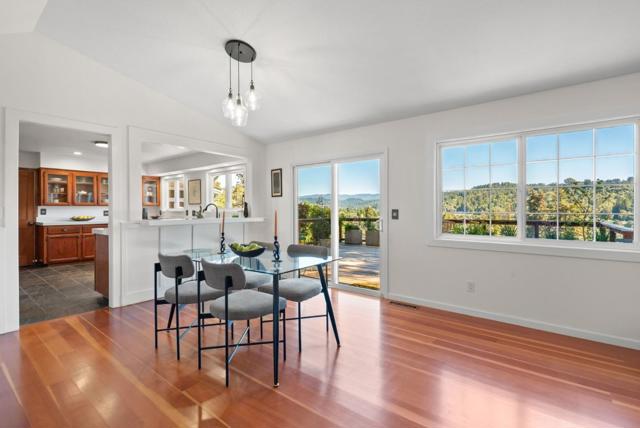 Welcome to 100 Camino Sinuoso, Scotts Valley. This intimate retreat is perfect for anyone looking for a space to call their own. An enchanting, windy road leads you to a secluded half-acre parcel perched above a serene mountain valley. Ideally situated on this parcel sits an adorable single-level 2-bedroom, 2-bathroom ranch-style home. Designed to prioritize indoor-outdoor living and maximize the sweeping valley views, this home features an open floor plan, large windows, and sliding glass doors to a spacious back deck. The recently updated kitchen boasts a breakfast bar, walk-in pantry, new quartz countertops, stainless steel appliances, and a chic farmhouse sink. One bedroom is tucked away on each side of the home, providing great separation of space for family members and guests. Dramatic wide plank cherry wood floors, solid wood doors, vintage-inspired door hardware, plentiful skylights, abundant storage, attached 2-car garage, detached carport, and a garden shed round out the list of amenities. Whether you're planting an edible garden on the lower portion of the property, enjoying coffee with a view from the back deck, or basking in the soothing sounds of nature while contemplating life's big questions, one thing is certain: this is it...your private refuge...this is Home.