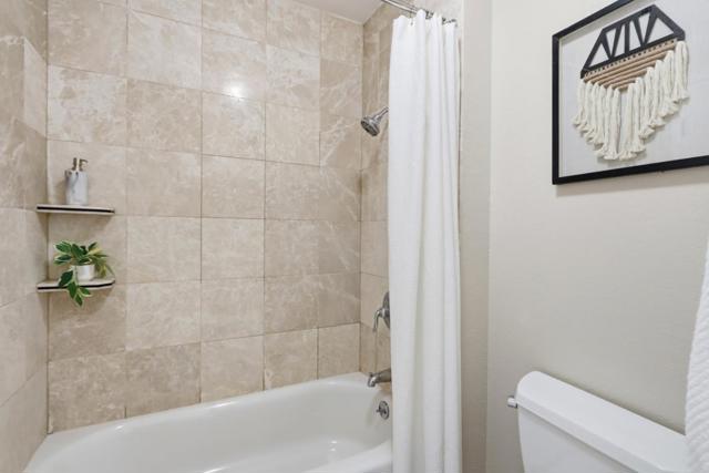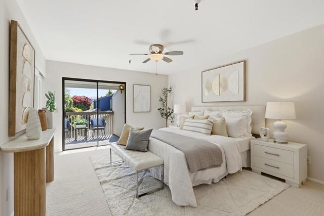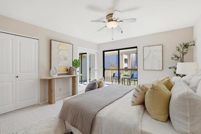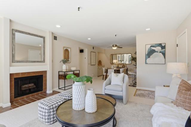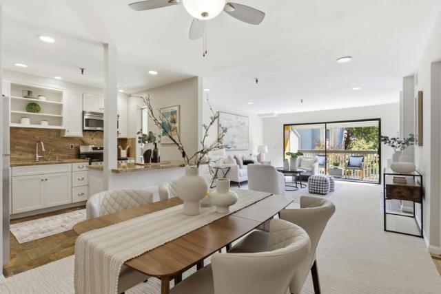 Spacious and elegant 1-bedroom, 1-bath condominium in the highly desirable Old Mill community. Ideally located on the upper level of the two-story E Building, this home features a bright deck with tranquil treetop views of the greenbelt and flowing stream. The serene living room offers beautiful views, a cozy gas fireplace, and direct access to the private deck, perfect for relaxing or entertaining. A separate dining area provides additional storage and space for gatherings. The oversized bedroom features three closet areas and a sliding glass door opening to the deck. The remodeled kitchen showcases contemporary cabinetry, granite counters, stainless steel appliances, and tile flooring. The updated bath includes a stylish vanity, tile floor, and tub/shower with tile surround. Additional features include recessed lighting, ceiling fans, new plush carpeting, fresh interior paint, inside laundry with stackable washer/dryer, and central heat and A/C. The lush Old Mill complex offers babbling brooks, lake with fountains, mature landscaping, two pools, two spas, and a clubhouse. Extra storage off the deck. Gated parking nearby with guest parking. Close to Mora Park, San Antonio Caltrain, shopping, dining, theaters, and major Silicon Valley employers.