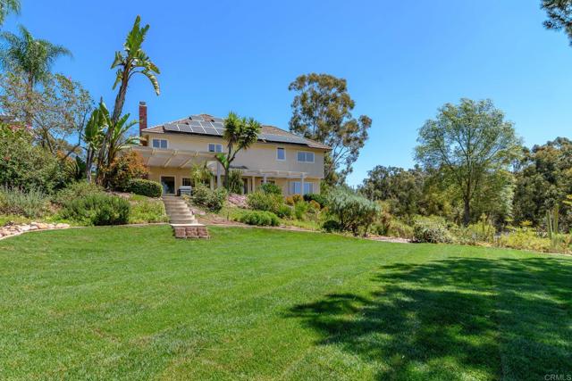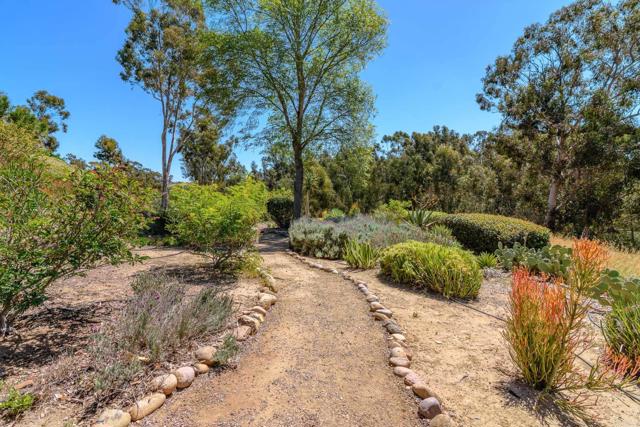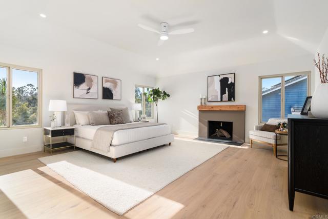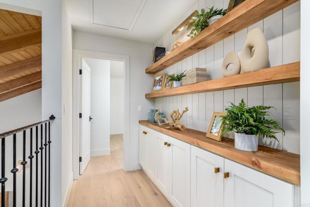 Tucked into a coveted Scripps Ranch corner lot with no neighbors on one side or directly behind, this fully renovated retreat opens to a private nature trail and protected open space—a rare slice of quiet just steps from your door. A grand foyer with iron-railing staircase sets the tone, opening to soaring vaulted wood-beam ceilings, wide-plank engineered hardwood, and a stone fireplace crowned with a striking live-edge wood surround. The chef's kitchen is pure showstopper: dramatic black quartz with bold white veining, crisp white shaker cabinetry, a glinting gold pot filler, an arched stone range hood, and a professional-grade Forno range made for slow Sunday cooking. The adjoining family room invites lingering with a second fireplace, custom white oak built-ins, shiplap accents, and sliders that pull the outdoors in. Upstairs, the primary suite is its own little hideaway—vaulted ceilings, a third fireplace, and a spa-inspired bath layered in warm oak, honed stone, matte black, globe sconces, a freestanding soaking tub, and a fluted-tile walk-in shower. A deep-blue glossy tile hall bath with walnut vanity and brass pulls adds a jewel-box moment, while a checkered marble laundry room with gold faucet brings charm to the everyday. A main-level bedroom doubles as study or guest retreat. Outside, mature trees, towering palms, and a pergola-shaded patio create a botanical escape. Owned Tesla solar with Powerwall and a three-car garage with epoxy round it all out.