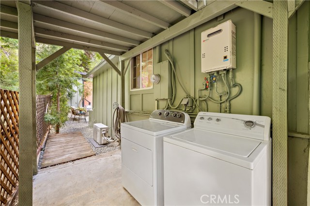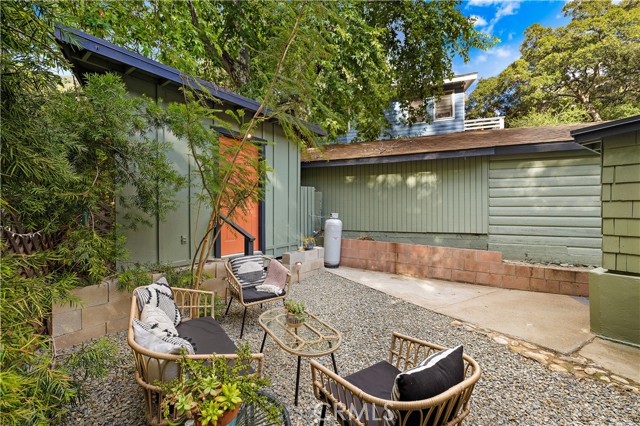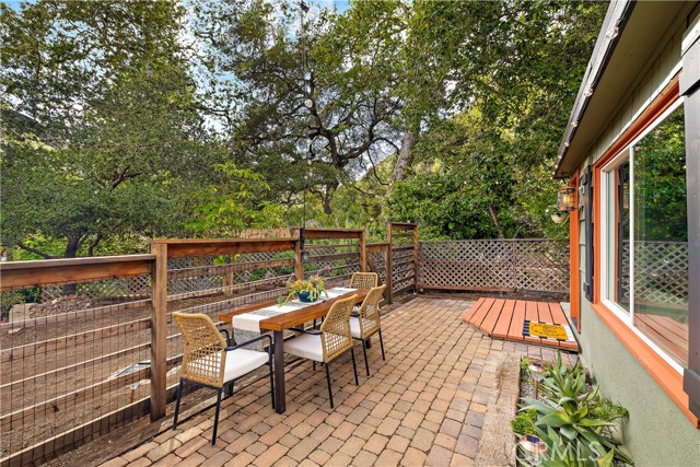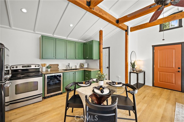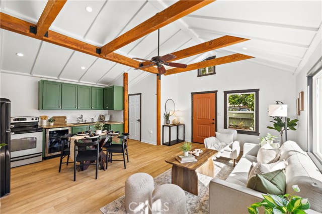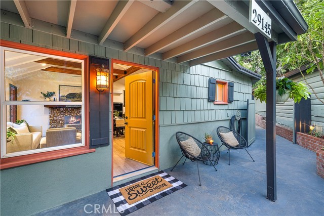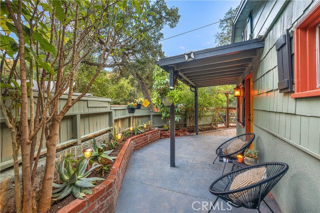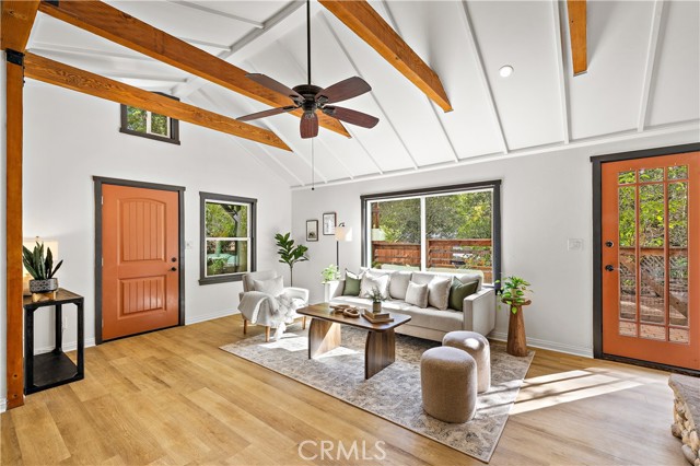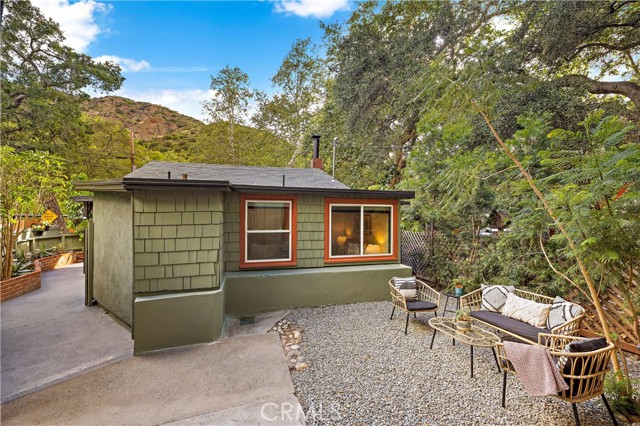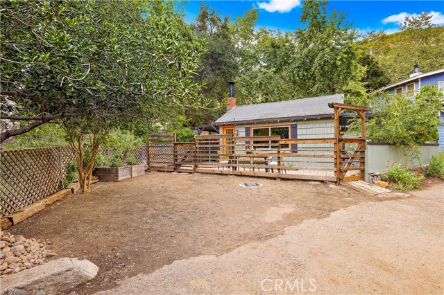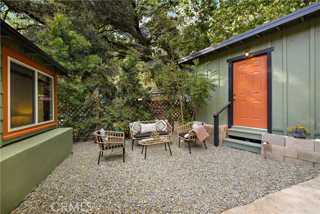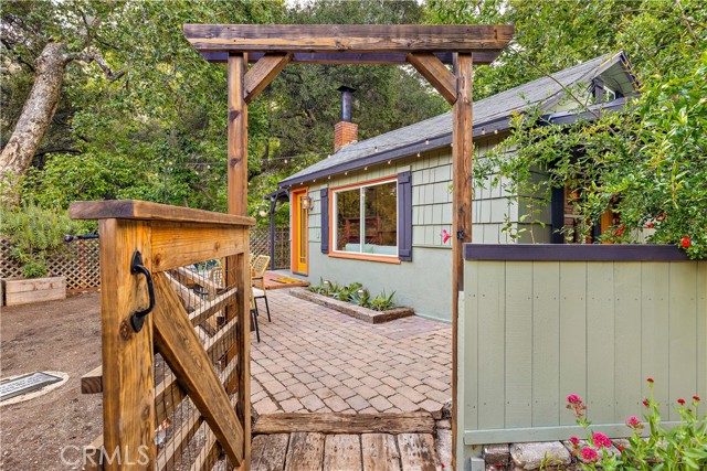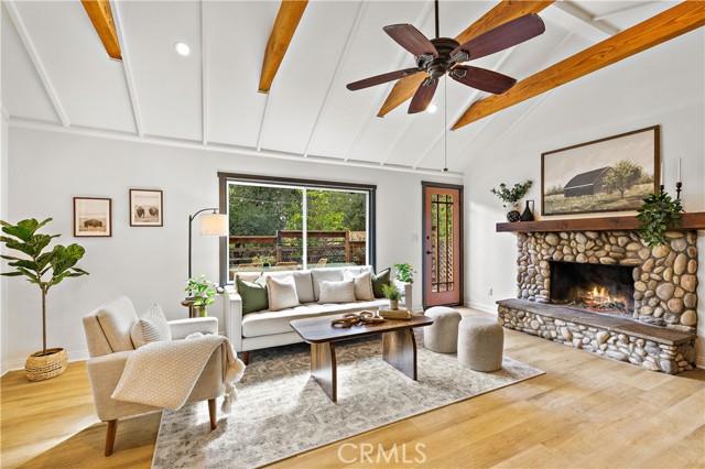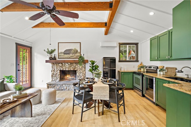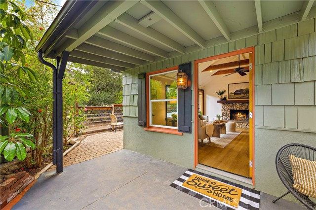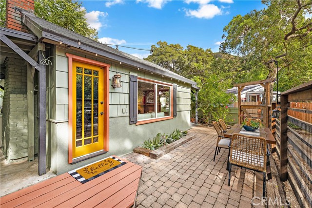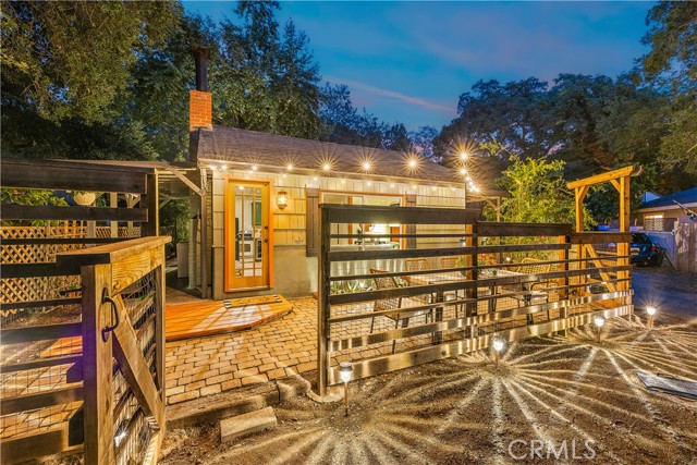 Nestled among mature sycamore and oak trees in a peaceful, nature-filled setting, this beautifully updated single-level home offers the perfect escape. Enjoy quiet mornings on the front porch or unwind in the evening surrounded by serene canyon views. Inside, an airy open-concept layout features soaring ceilings with exposed wood beams and a striking vintage rock, wood-burning fireplace. Fresh interior and exterior paint brighten the space, complemented by upgraded luxury vinyl flooring throughout. The open kitchen includes a stainless steel electric range, refrigerator, and wine refrigerator - all included in the sale. The primary bedroom features picture windows overlooking the backyard, a closet, and ceiling fan. Spacious bathroom off hallway features tiled shower and beautiful wood vanity w/ ample storage. Approximately 13 years ago, the home was extensively remodeled with copper plumbing, updated electrical, dual-pane windows, drywall, rafters, insulation, and a tankless water heater. The private backyard features a workshop/storage shed, while the front yard offers a raised-bed vegetable garden and a beautifully designed outdoor dining patio, enhanced by soft string lighting - perfect for relaxed evenings or entertaining guests. Additional features include laundry facilities on side yard, a mini-split HVAC system, and parking for two vehicles. Located in a one-of-a-kind historic community known for its close proximity to the Cleveland National Forest trails, community park, local dining, and a number of local events throughout the year. This home offers a rare escape from the hustle & bustle, while still positioned near Irvine Lake, major FWYs, and a short drive to the coast. No HOA. No Mello-Roos. Come experience canyon living at its finest.