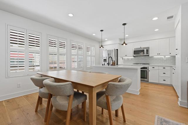 This spacious and highly upgraded 3-bedroom, 2.5-bath, 1500 sq ft townhome offers contemporary living at its finest. Flooded with natural light, the living room features soaring high-volume ceilings and a cozy fireplace, creating a bright and inviting atmosphere. The beautifully updated interior showcases wide-plank flooring, white cabinetry, stone countertops, stainless steel appliances, a gas cooktop, and plantation shutters throughout. Energy-efficient double-pane windows enhance comfort and efficiency. Upstairs offers three generously sized bedrooms, providing plenty of space for family, guests, or a home office. Enjoy indoor-outdoor living with a large private patio—perfect for relaxing or entertaining. Additional highlights include a two-car attached garage with an installed EV charger. Located in a gated community just minutes from beaches, shopping, dining, and top-rated schools—this home truly has it all!
