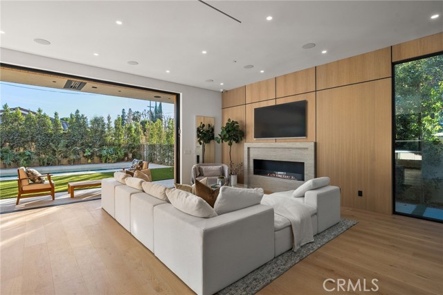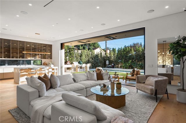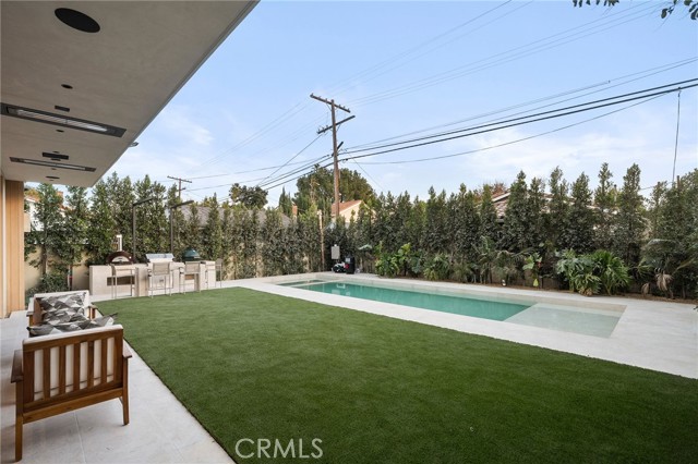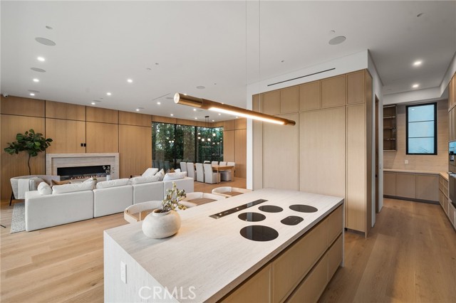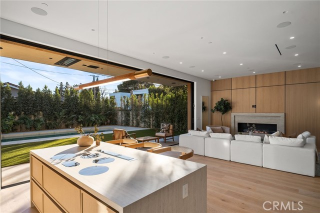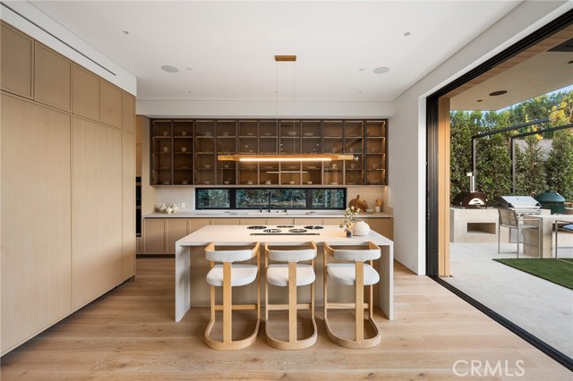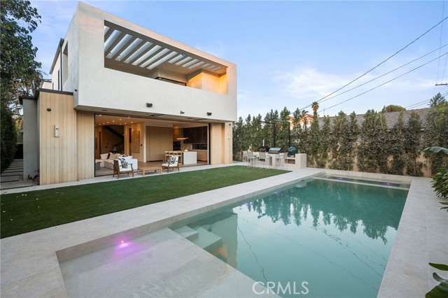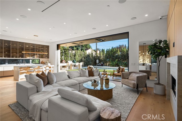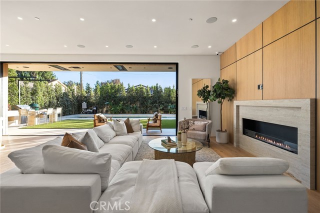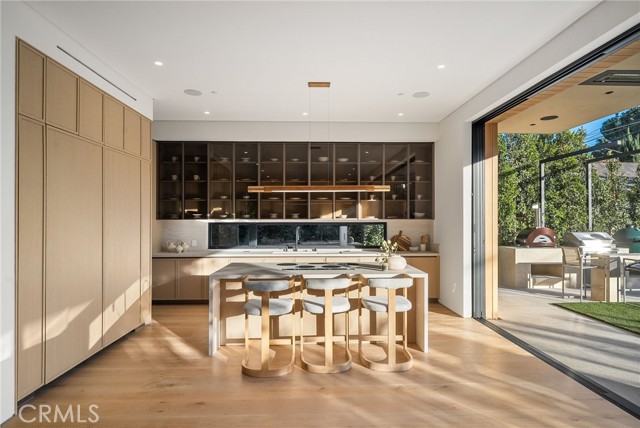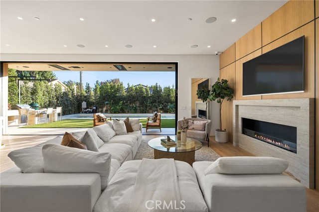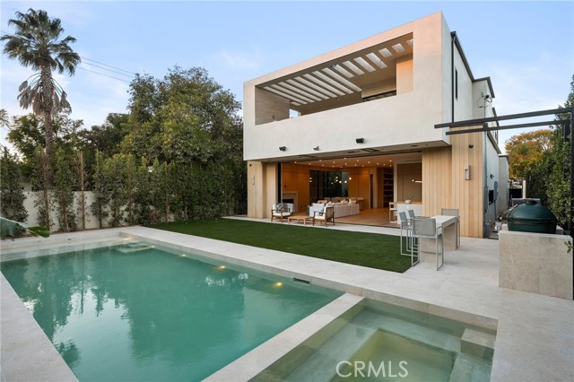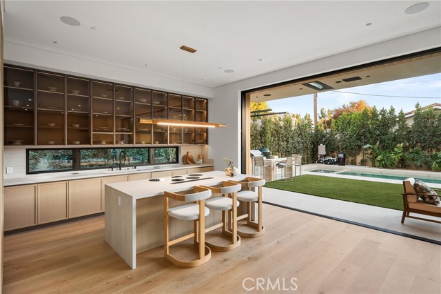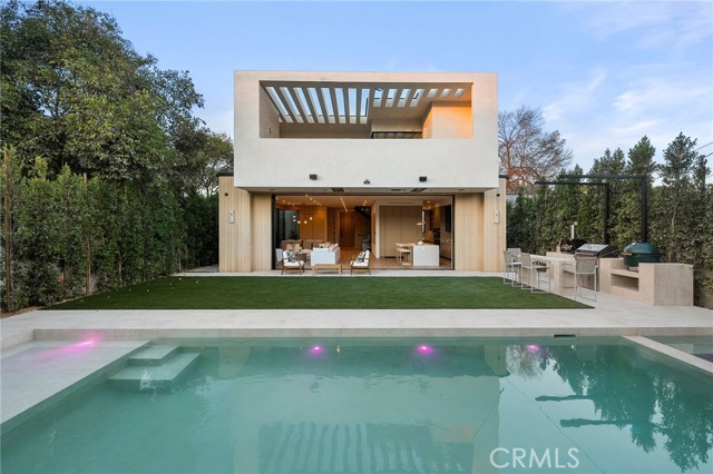 Welcome to an exceptional newly constructed modern estate by the highly regarded MLR Development, ideally situated within the coveted Kester Elementary district of Sherman Oaks. Designed with both sophistication and functionality in mind, this residence offers an elevated living experience defined by refined finishes, expansive volumes, and seamless indoor-outdoor integration. A dramatic entry introduces soaring ceilings and a striking floating staircase, setting the tone for the home’s architectural elegance. The open-concept layout effortlessly connects the living, dining, and kitchen spaces—creating an ideal environment for both grand entertaining and everyday living. At the heart of the home, the chef’s kitchen is a true showpiece, appointed with custom Italian-style cabinetry, an oversized center island, and a suite of premium Miele appliances, including double ovens and a built-in coffee system. A well-equipped butler’s pantry with additional prep space and a generous walk-in pantry enhances both convenience and storage. The residence features four spacious bedrooms, each designed as a private retreat with beautifully appointed en-suite bathrooms showcasing sleek tile work and spa-inspired finishes. The primary suite is a sanctuary unto itself, complete with a stone fireplace, an expansive walk-in closet, and a luxurious bath featuring a freestanding soaking tub, dual vanities, and an oversized rain shower. A private terrace off the suite, highlighted by a built-in fireplace, offers a serene escape. Additional amenities include a generously sized upstairs laundry room with sink, integrated Control4 smart home technology, surround sound, and energy-efficient systems, all complemented by abundant natural light streaming through floor-to-ceiling glass. The outdoor setting is equally impressive, designed for year-round enjoyment with a covered patio, stone fireplace, recessed heaters, and a resort-style pool and spa. A fully equipped outdoor kitchen featuring a built-in barbecue, pizza oven, and smoker, along with a grassy yard, creates the ultimate space for entertaining. Ideally located just moments from premier dining, shopping, and top-rated schools, this home offers a rare combination of modern design and intimate warm luxury Unfurnished property.