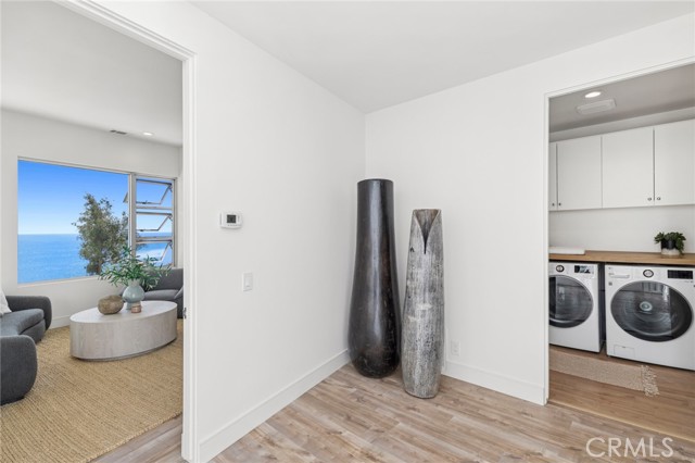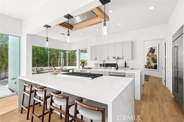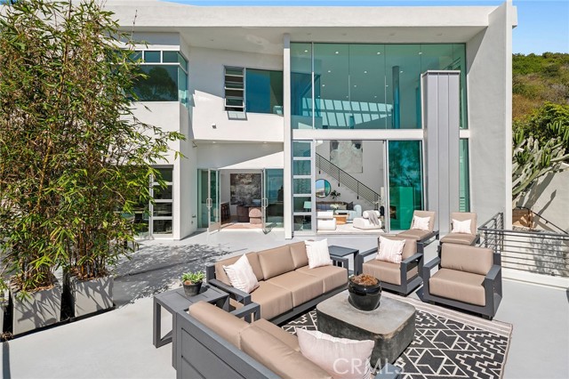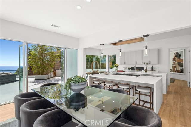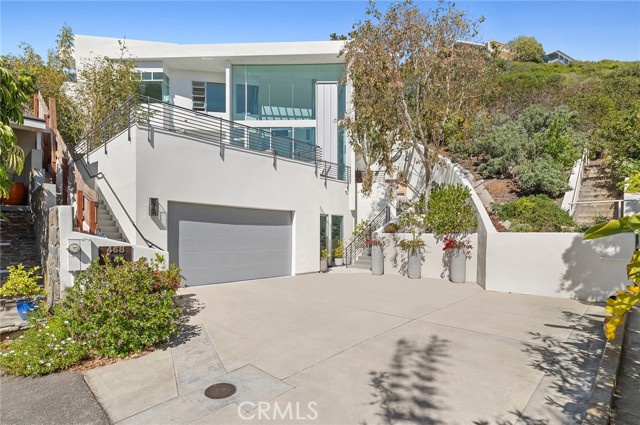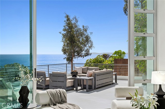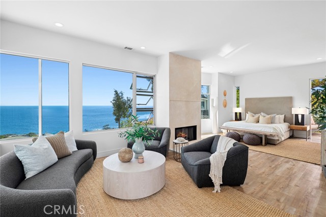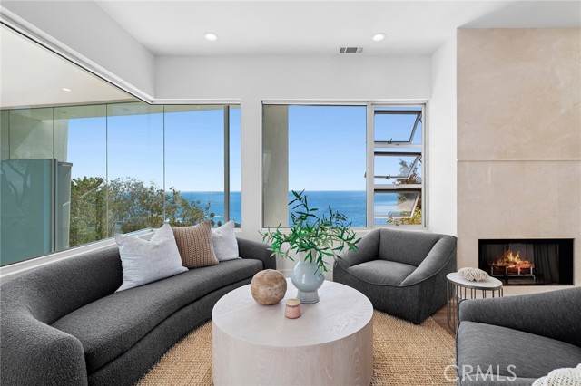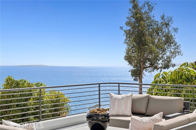Situated in the highly sought-after upper Victoria Beach neighborhood, this private estate is a true architectural jewel, showcasing striking modern design and offering breathtaking views of Catalina Island, the coastline, and white-water ocean. This exceptional home features 4 bedrooms plus a flex room, and 4.5 bathrooms, with soaring ceilings and expansive walls of glass that open seamlessly to a large ocean-view deck—perfect for indoor-outdoor living and entertaining. The main level boasts a brand-new chef’s kitchen equipped with an 8-burner Wolf counter top range plus double ovens, a commercial-grade Sub-Zero refrigerator, two dishwashers, and dual oversized islands with waterfall-edge countertops and bar seating. The dramatic living area features 20-foot ceilings, abundant natural light, and an open-concept layout that includes a dining area, breakfast nook, and direct access to outdoor patios. A main-level bedroom and full bath provide ideal accommodations for guests. Upstairs, the grand primary suite offers sweeping ocean, white-water, hillside, and Catalina Island views. This luxurious retreat includes a fireplace, an oversized sitting area, a spa-inspired bathroom with soaking tub, and a spacious walk-in closet. Two additional bedrooms are generously sized and thoughtfully designed, each featuring en-suite baths and built-in closets; one bedroom also opens directly to a private, multi-level deck, enhancing the indoor-outdoor living experience. Additional highlights include a versatile bonus room with a private entrance—ideal for a flex space, gym, or media room—a two-car garage, and an oversized driveway with ample parking. Multiple indoor and outdoor living spaces provide the perfect setting for both entertaining and relaxing in a serene, private environment. Located just a few blocks from the sand at Victoria Beach and moments from the Montage Resort Laguna Beach, world-class dining, art galleries, and entertainment, this home offers the ultimate Laguna Beach lifestyle.