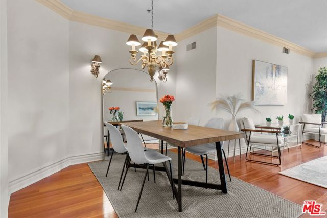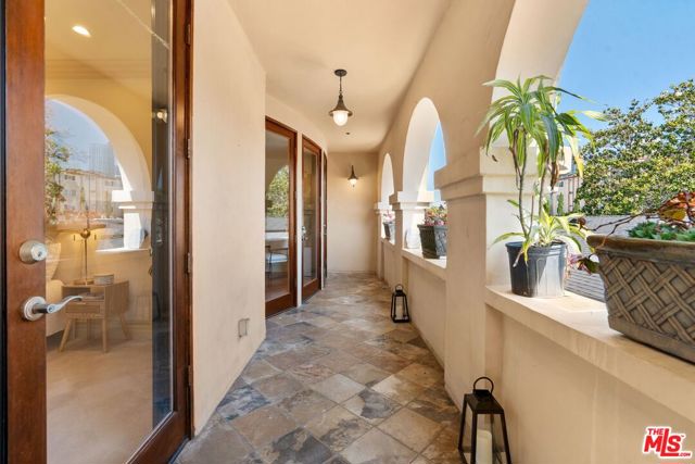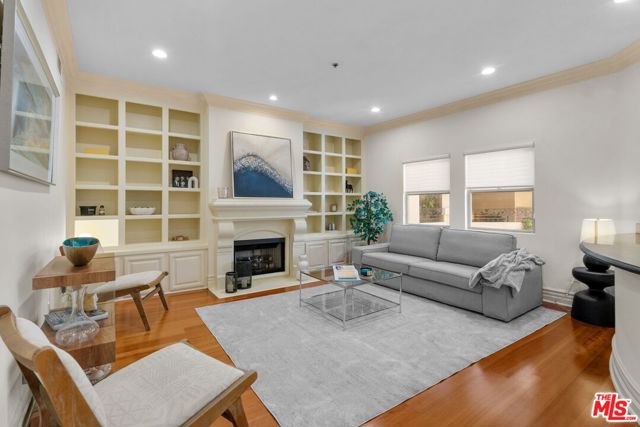 open-air courtyard with a fountain, creating an inviting first impression. Inside, the home unfolds with a graceful entry rotunda and an expansive, well-balanced floor plan. The open kitchen is appointed with stone countertops, stainless steel appliances, generous storage, and a breakfast bar that connects seamlessly to a cozy den with a fireplace. The spacious living and dining areas are framed by a striking wall of wood-framed windows and French doors, opening to an covered terrace. This outdoor space creating effortless indoor-outdoor flow. The primary suite serves as a private retreat, featuring direct access to the terrace, a custom walk-in closet, and a spa-inspired bath, soaking tub, and separate shower. The second bedroom is positioned on the opposite side of the home, offering privacy for guests or additional flexibility. Rich wood floors, elegant crown moldings, graceful arches, artisan tile accents, and soaring ceilings come together to create a sense of warmth, depth, and timeless character throughout the home. Additional amenities include in-unit laundry, central comfort, and gated underground parking with two spaces, along with guest parking.Ideally located on a quiet, tree-lined street just moments from Century City, Westwood Village, UCLA, Beverly Hills, and Rancho Park Golf Course, this residence offers both comfort and convenience in one of the Westside's most central locations.