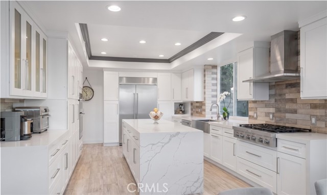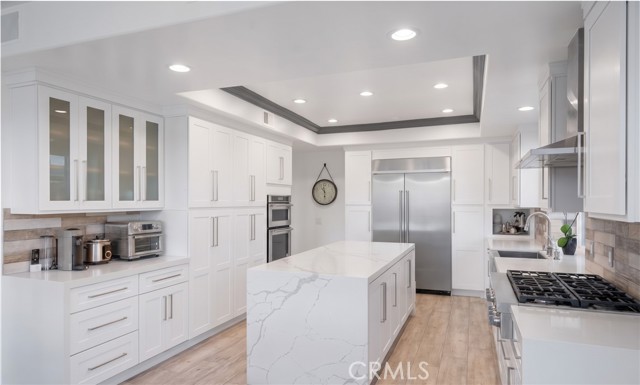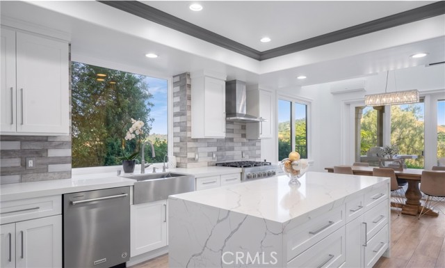 Set behind the guard gates of the Westridge community, this is the largest and most sought-after floor plan in the neighborhood, offering 180-degree views of the Valley and Warner Center. A dramatic two-story foyer welcomes you in, crowned by a large skylight that pours natural light across the entry. Wood beam ceilings add warmth and architectural character throughout the main level. Fresh interior paint gives the home a clean, move-in-ready feel. The kitchen has been completely updated and anchors the heart of the home. Marble countertops, a center island, six-burner cooktop, and stainless steel appliances give it the finish level buyers at this price point expect. It opens directly to a large family room, creating an effortless flow for both weekday mornings and weekend entertaining. The powder room has also been refreshed with updated finishes. Formal living and dining rooms handle the more polished occasions. A separate bonus room with a fireplace and wet bar offers flexibility as a media room, game room, or second entertaining space. Five bedrooms and five bathrooms provide the scale and separation this plan is known for. One bedroom with an ensuite bath sits on the main level, ideal as a guest suite, office, or in-law accommodation. Upstairs, four additional bedrooms include a true primary retreat with a sitting area, fireplace, and a private balcony framed by the views. The primary bath features dual vanities, two closets, and a large soaking tub. Outside, the yard was built for entertaining. A pool and spa, dedicated BBQ area, and open patio space take full advantage of the view line. A three-car garage adds everyday practicality. Westridge is a guard-gated community with a private park and tennis courts, set just minutes from the Calabasas Commons, Las Virgenes schools, and the 101 freeway. The combination of security, amenities, and location is one of the reasons this neighborhood holds its value so consistently. Homes offering this floor plan and this view line rarely come to market in Westridge. A private showing will confirm why.