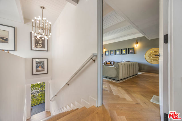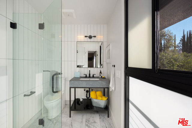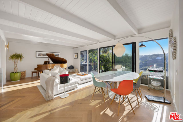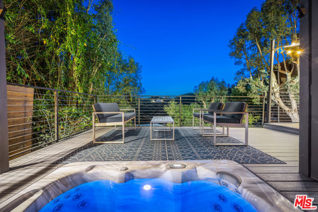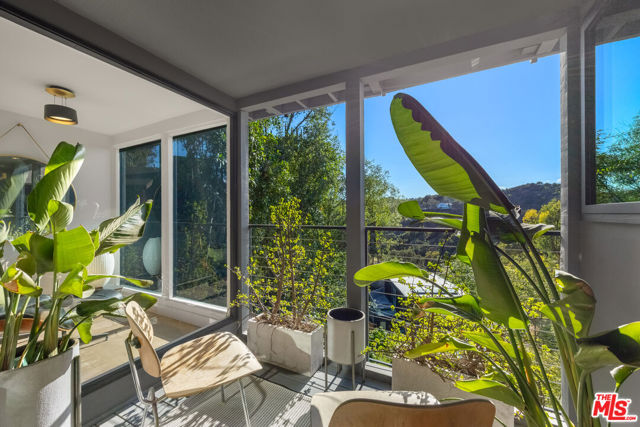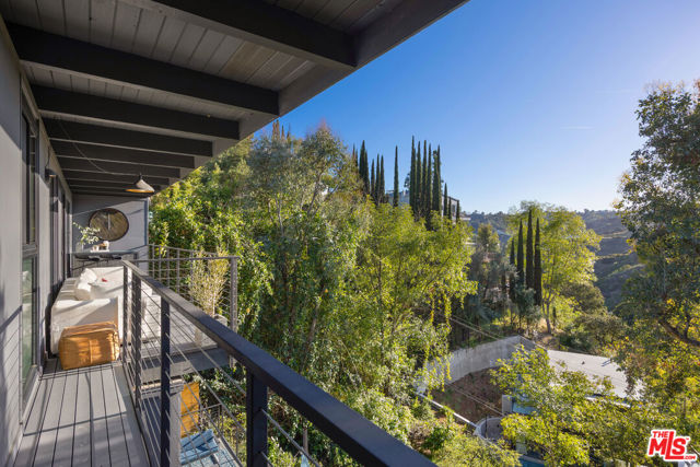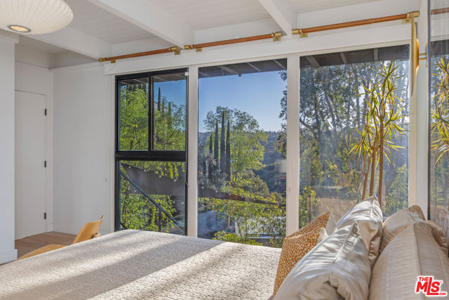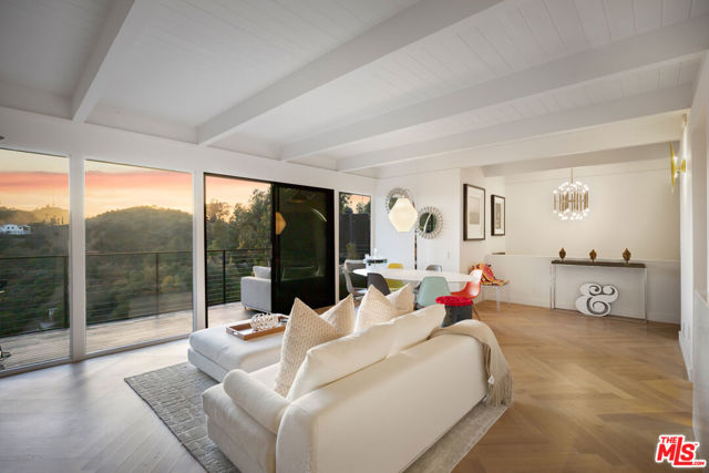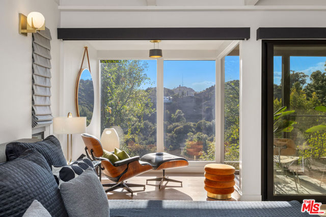 Welcome to Sunridge Hollywood Hills, a reimagined mid-century retreat where panoramic canyon views meet golden afternoon light that floods the interiors through walls of glass, all just minutes from West Hollywood, revealed through a crisp white breezeway reminiscent of the iconic Parker Palm Springs. A bold vermillion door opens into a space that immediately slows you down: morning begins softly here - light filtering through the canyon, coffee in hand, as lush greenery stretches endlessly beyond the glass. Every room is oriented toward the views, creating a constant connection to nature that feels both grounding and expansive as the day naturally unfolds. The open-concept living and dining areas flow effortlessly into expansive balconies, where indoor and outdoor living blur into one continuous experience. An outdoor bar invites casual afternoons with friends or quiet moments taking in the stillness of the hills, while unforgettable sunset and hillside views become part of the everyday rhythm. At the center, a sleek Carrara open kitchen with Bertazzoni appliances anchors the space - equally suited for daily living or hosting with intention. Norwegian white oak floors run throughout, adding warmth beneath the clean architectural lines and enhancing the home's inviting, elevated feel. Designed for both comfort and hosting, the layout reveals a rare level of flexibility with two primary suites. On its own upper level, a separate second primary retreat - currently styled as a cinema room with bar and ensuite - becomes an entertainer's dream, offering a fully private escape for guests while still capturing the same sweeping canyon views. As the day begins to wind down, the lower level shifts into a more tranquil rhythm: the primary suite becomes a true sanctuary - waking to canyon vistas, stepping out to a private seating area, or unwinding inside a spa-like bath wrapped in striking blue tile with dual vanities and a spacious rainfall shower, where lush green views of surrounding trees continue the home's seamless connection to nature. The third bedroom - again with floor-to-ceiling forest views - offers flexibility as a guest room or an inspiring home office where the workday feels worlds away. At last, evenings take center stage outdoors! The expansive, secluded deck with hot tub transforms into the heart of the home - alive with candlelit dinners, laughter-filled gatherings, or quiet moments under star-filled skies, surrounded by towering greenery and the soft, distant call of resident owls. It's the kind of setting that feels cinematic, unforgettable, and entirely your own. Come experience the magic of Sunridge Hollywood Hills - a rare, ultra peaceful canyon escape where design, privacy, and nature come together effortlessly!