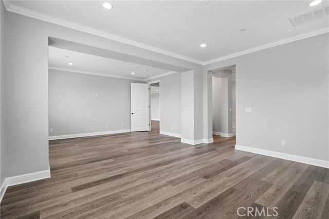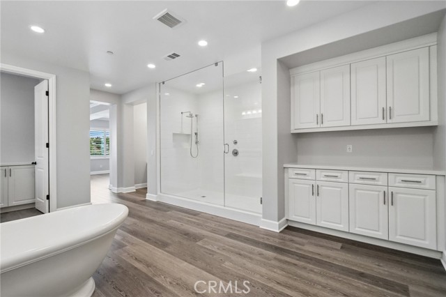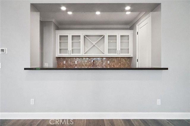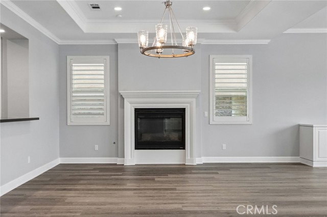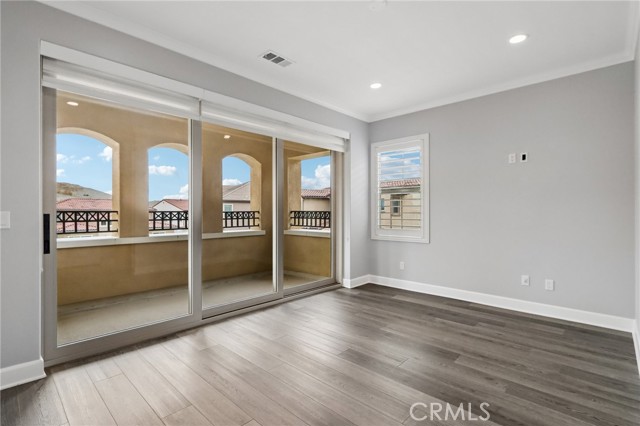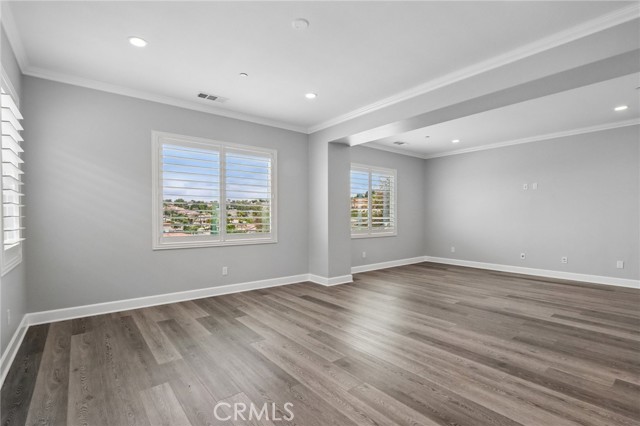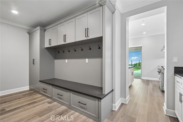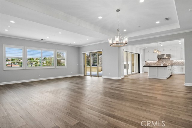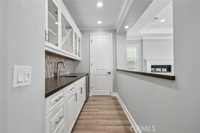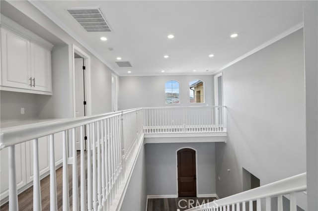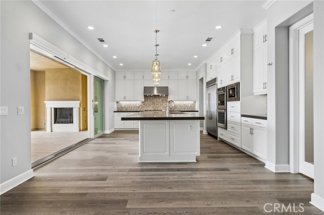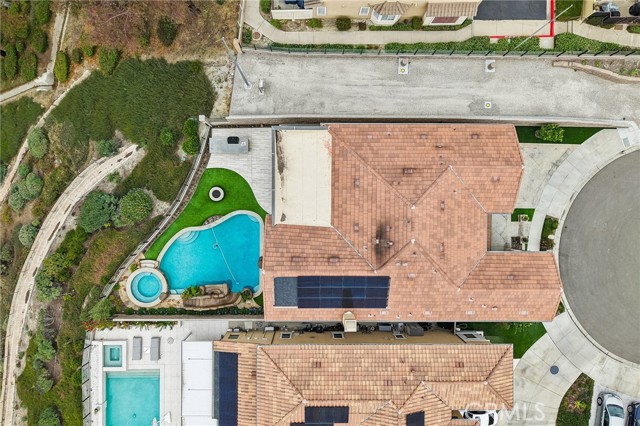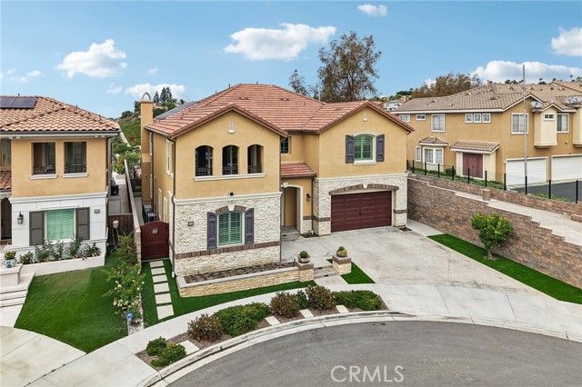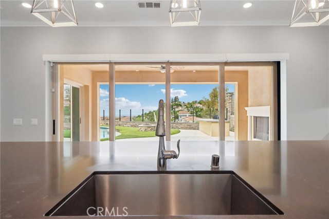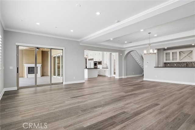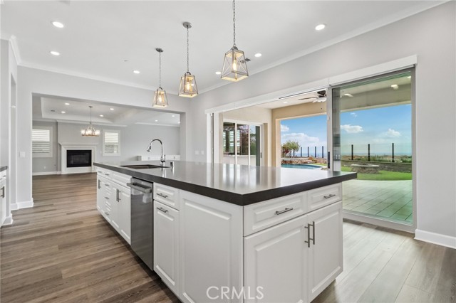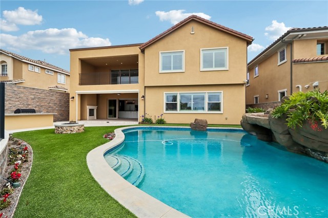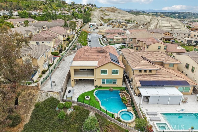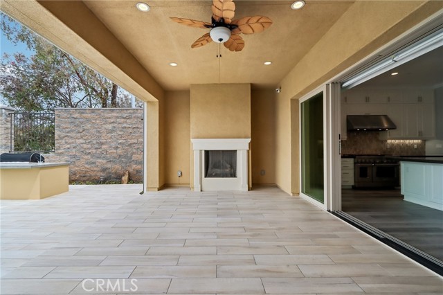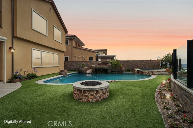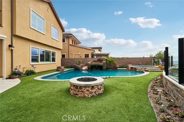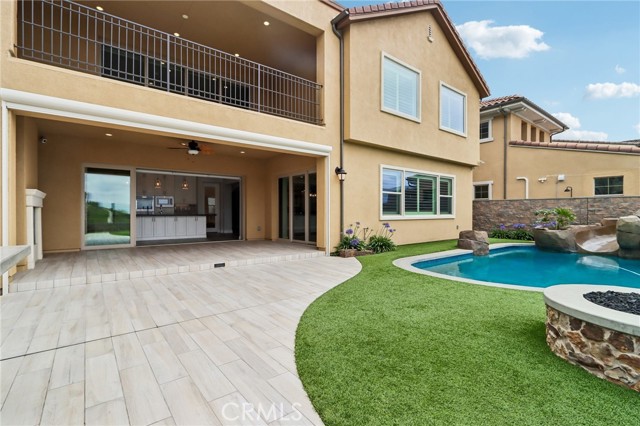 Stunning Mediterranean estate on a cul-de-sac in the highly desirable Portola Hills community of Trabuco Canyon, where luxury finishes and resort-style living come together beautifully. Inside, a soaring two-story foyer with wide-plank flooring and elegant staircase leads to an open great room with tray ceiling, crown molding, and pocket sliding doors opening to a covered outdoor California room with fireplace and ceiling fan. The chef's kitchen impresses with floor-to-ceiling white cabinetry, built-in KitchenAid appliances including a built-in refrigerator and double wall ovens, an oversized dark-stone island, and a stunning diamond mosaic tile backsplash. The butler's pantry and wet bar features glass-front cabinets, wine rack, beverage refrigerator, and matching backsplash perfect for entertaining. The spa-inspired primary bath offers a freestanding soaking tub, dual vanities with vessel sinks, and a dedicated makeup vanity alcove. Outside, enjoy a freeform pool with rock grotto, waterfall and slide, separate spa, stone fire pit, artificial turf, and a covered patio with fireplace all framed by hillside views. Paid solar, LG washer and dryer included, and plantation shutters throughout. Community amenities include a pool, tennis courts, sand volleyball, fitness room, parks, and access to Whiting Ranch Wilderness Park trails. Served by award-winning Saddleback Valley Unified schools including Portola Hills Elementary and Trabuco Hills High School, and minutes from shopping, dining, and the 241 Toll Road.