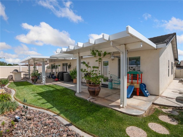 Charming and spacious 4-bedroom, 2-bath home offering 2,119 sq ft of beautifully maintained living space in the heart of Victorville! Built in 2004, this move-in ready property features a fully updated kitchen with white glass-front cabinetry, quartz countertops, and a large waterfall island, along with stainless steel appliances including the refrigerator. The open layout is enhanced by vaulted ceilings, hardwood and laminate wood flooring throughout, and modern light fixtures and ceiling fans. Enjoy cozy evenings by the upgraded floor-to-ceiling fireplace, a new water heater. The home has been meticulously cared for, with recent inspections completed on the roof, air ducts, A/C, and heater. Step outside to a fully landscaped front and backyard featuring vinyl fencing, an irrigation system with timers for each plant, new landscape lighting, and flood lights in both the front and backyard. The fully covered aluminum patio and built-in barbecue make this home perfect for entertaining, while the security gated front courtyard adds charm and privacy. This is a must-see home combining comfort, style, and thoughtful upgradesācome tour this property today!