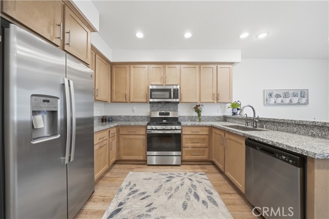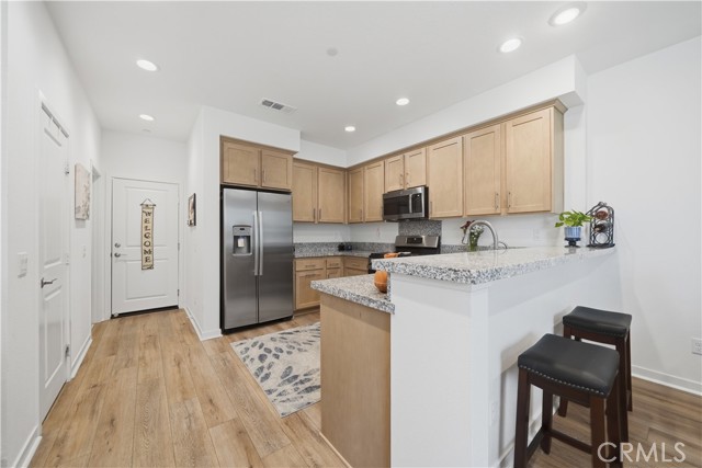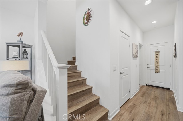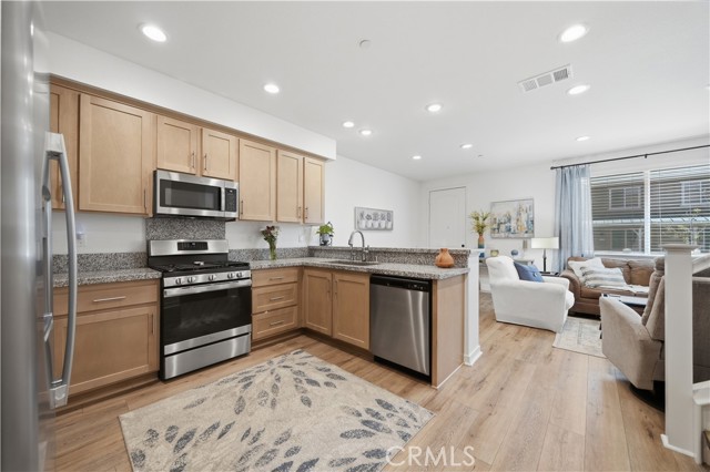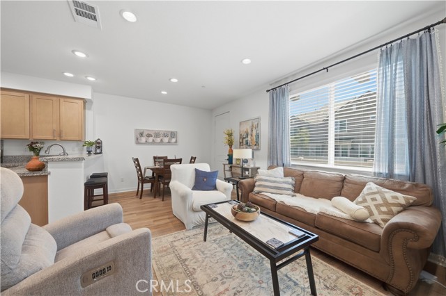Private front porch entry sets the tone for this well-maintained 3-bedroom, 2.5-bathroom condo located in the highly desirable Sommers Bend community of Temecula. The main level offers an open-concept layout with a combined living and family room that flows directly into the kitchen, creating a nicely connected living space. The kitchen offers stainless steel appliances, granite countertops, bar seating, and ample cabinet storage—well-suited for entertaining. Luxury vinyl flooring runs throughout the main living areas. (very nice) A powder room and direct access to the attached garage are also located on the first floor. Upstairs, a spacious hallway leads to the primary suite, which features a private balcony with community views. The primary bathroom includes a separate tub and shower, dual vanity, and a large walk-in closet. Two additional bedrooms and a full hallway bathroom complete the upper level. Additional features include recessed lighting, Leased Solar, built-in elements, and a clean, well-cared-for interior. Residents of Sommers Bend have access to a range of amenities, including resort-style pools, clubhouse, fitness facilities, parks, walking trails, and community gathering spaces, all within close proximity to schools, shopping, and Temecula Wine Country! Welcome Home!