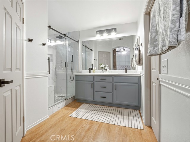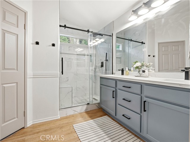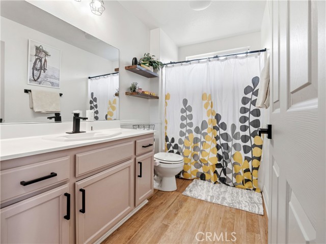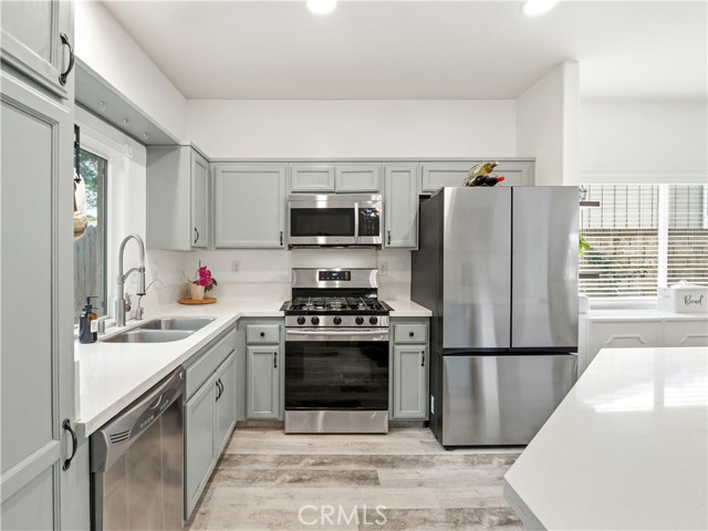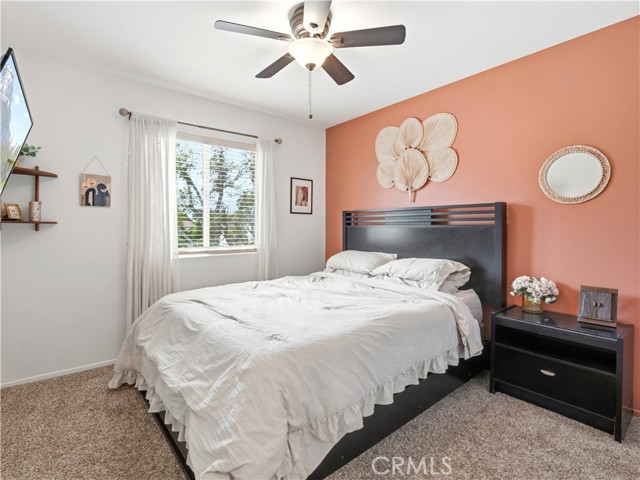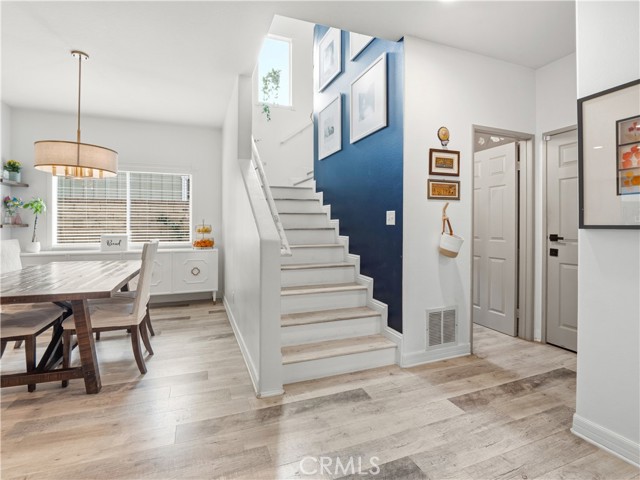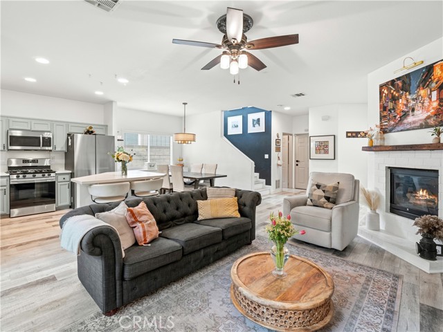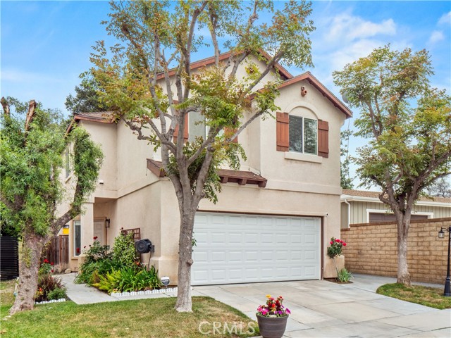 Adorable, trendy 4 bed + 3 bath home in the heart of Newhall near Main Street Newhall, offering over 1,800 sq ft of living space, paid solar, low HOA, and no Mello-Roos taxes with easy access to both the 5 and 14 freeways. This stylish home features a beautifully upgraded kitchen with modern cabinetry, a center island, white quartz countertops, and stainless steel appliances, seamlessly opening to the dining and living areas. The inviting living room showcases a cozy white brick fireplace with mantle, while a charming powder room with designer wallpaper adds a trendy touch downstairs. Upstairs, the spacious primary suite offers a wood accent wall and an upgraded ensuite with dual sink vanity, a stunning glass-enclosed walk-in shower, and a walk-in closet. Three additional well-appointed bedrooms feature stylish wallpaper accents and share a full bathroom. A thoughtfully designed laundry room with cabinetry and folding table adds convenience. Additional highlights include high ceilings, upgraded flooring, modern light fixtures, ceiling fans, and a 2-car direct access garage. Step outside to a private, adorable backyard with a grass area and manicured trees, creating a peaceful outdoor space. Ideally located near downtown Newhall, enjoy close proximity to the Laemmle Newhall theater, shopping, dining, parks, schools, and convenient city transportation. Don’t let this one slip away!!!