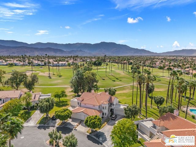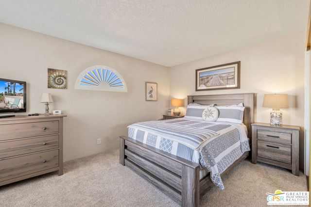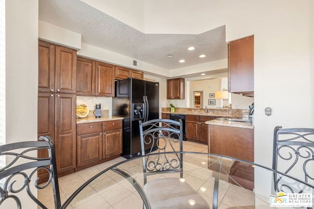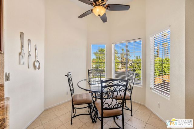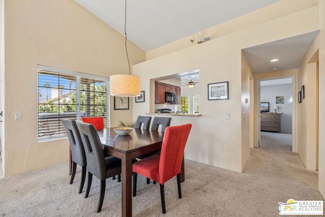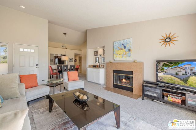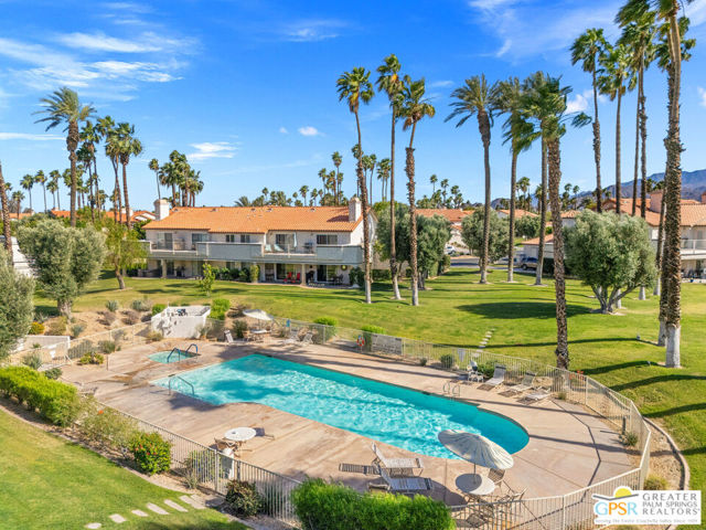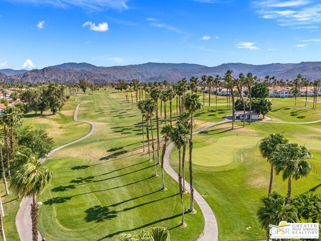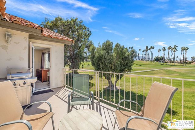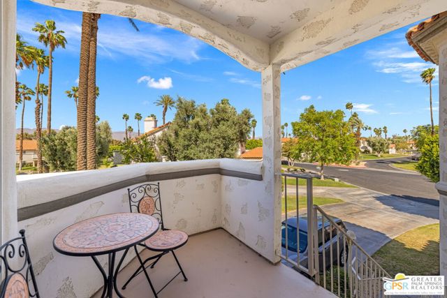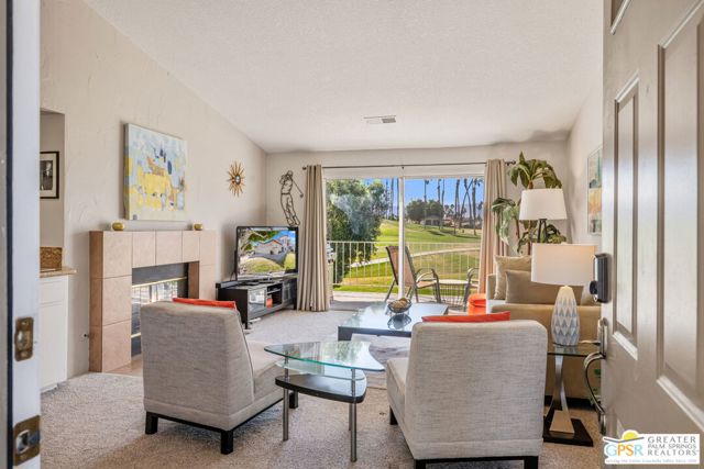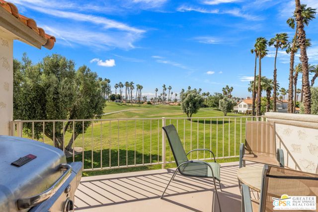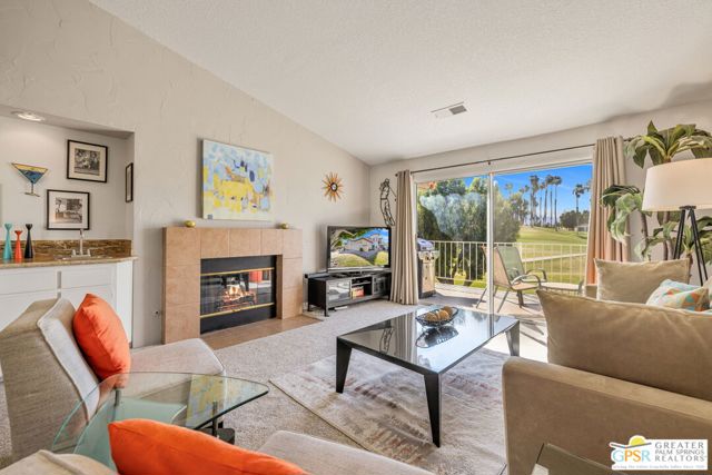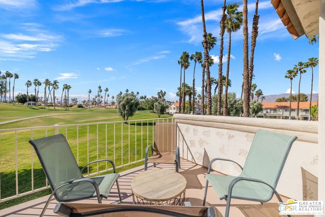 Positioned on the golf course behind the gates of Desert Falls Country Club, this upper-level villa offers panoramic fairway and mountain views, short-term rentals are permitted, and it is conveniently located in central Palm Desert. The open living area is anchored by a classic gas fireplace and a built-in wet bar, with large sliding glass doors that extend the living space to a balcony overlooking the greens. The kitchen features rich wood cabinetry, updated granite countertops, and a pass-through window that seamlessly connects to the dining area. The primary suite includes a semi-circular sunburst window, mirrored closets, a spacious en-suite bath with a walk-in shower, and direct access to the main balcony. A comfortable guest bedroom and a second full bath complete the layout. Two-car garage parking is included. Desert Falls Country Club amenities include a Championship Golf Course, fitness center, tennis and pickleball courts, and 29 pools and spas throughout the community.