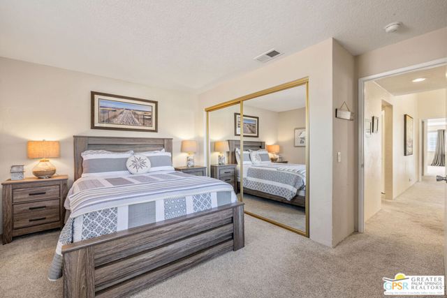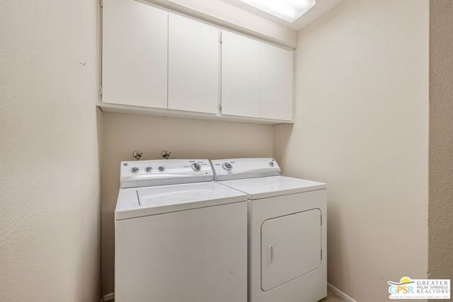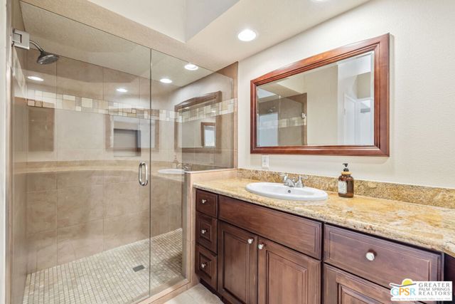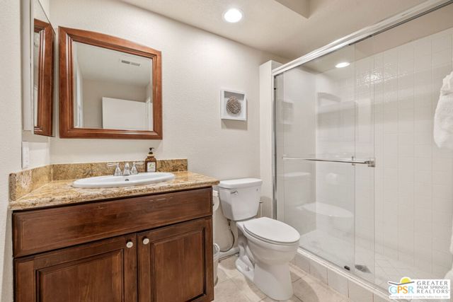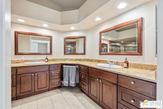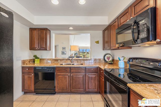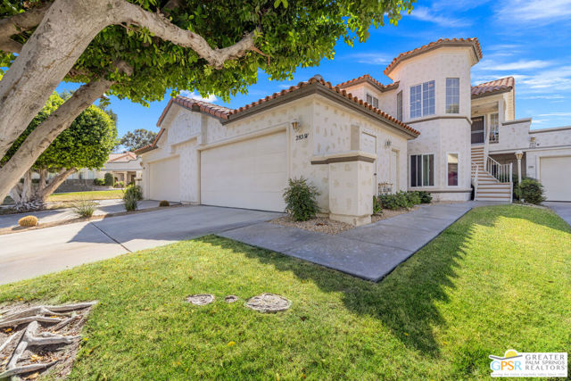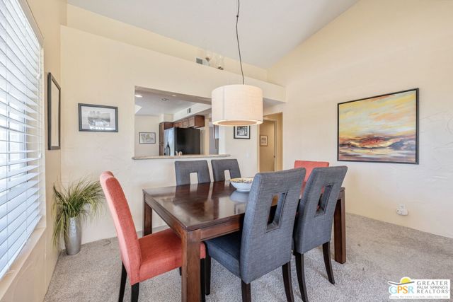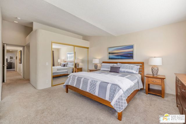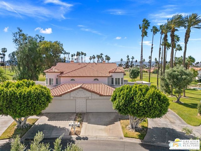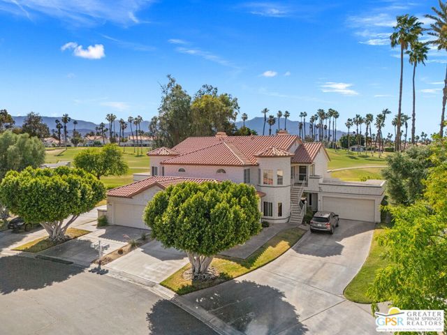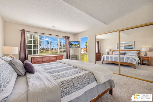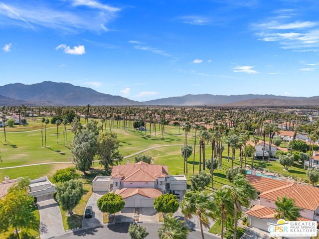 Positioned on the golf course behind the gates of Desert Falls Country Club, this upper-level villa offers panoramic fairway and mountain views, short-term rentals are permitted, and it is conveniently located in central Palm Desert. The open living area is anchored by a classic gas fireplace and a built-in wet bar, with large sliding glass doors that extend the living space to a balcony overlooking the greens. The kitchen features rich wood cabinetry, updated granite countertops, and a pass-through window that seamlessly connects to the dining area. The primary suite includes a semi-circular sunburst window, mirrored closets, a spacious en-suite bath with a walk-in shower, and direct access to the main balcony. A comfortable guest bedroom and a second full bath complete the layout. Two-car garage parking is included. Desert Falls Country Club amenities include a Championship Golf Course, fitness center, tennis and pickleball courts, and 29 pools and spas throughout the community.